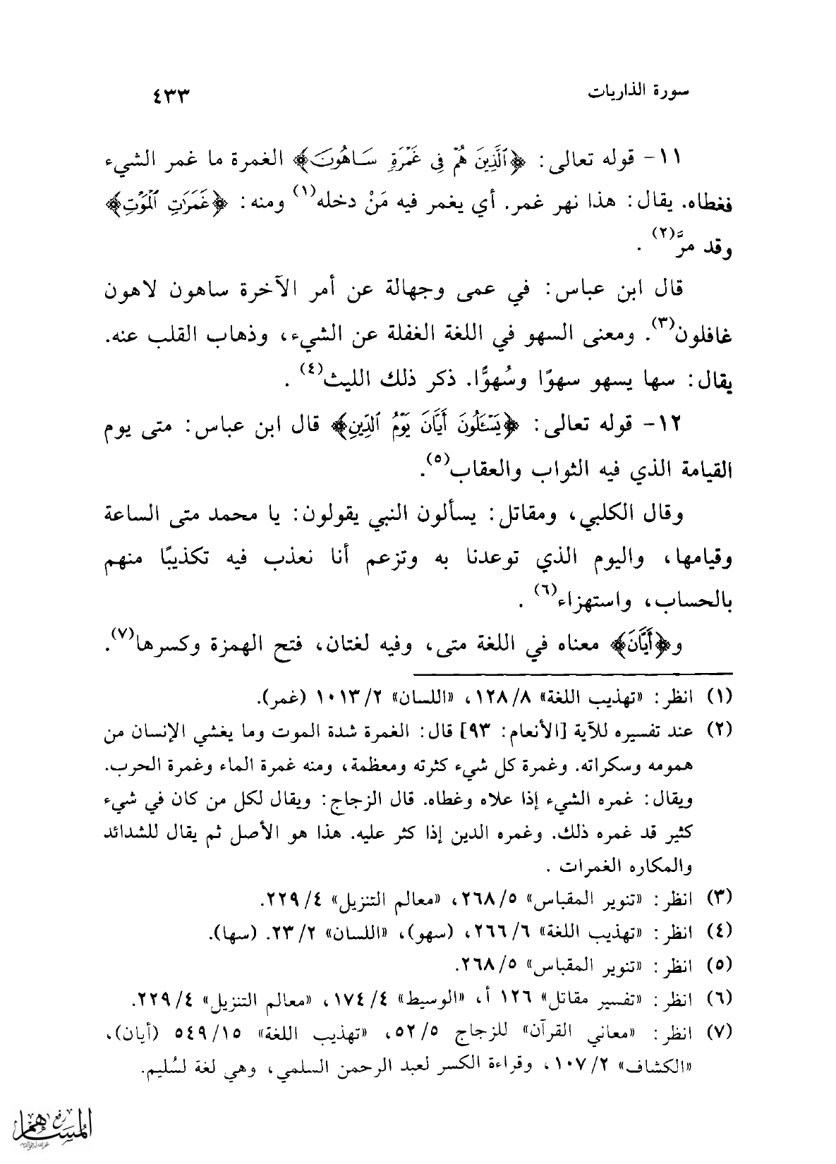 11 - قوله تعالى: {الَّذِينَ هُمْ في غَمْرَةٍ سَاهُونَ} الغمرة ما غمر الشيء فغطاه. يقال: هذا نهر غمر. أي يغمر فيه مَنْ دخله (¬1) ومنه: {غَمَرَاتِ الْمَوْتِ} وقد مرَّ (¬2).