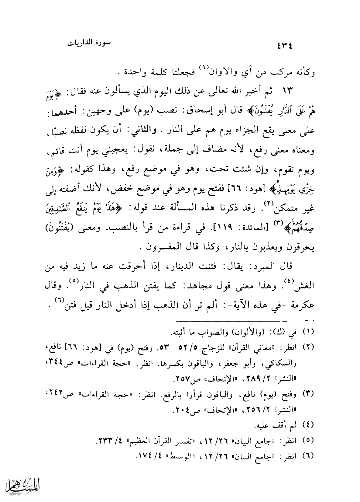 13 - ثم أخبر الله تعالى عن ذلك اليوم الذي يسألون عنه فقال: {يَوْمَ هُمْ عَلَى النَّارِ يُفْتَنُونَ} قال أبو إسحاق: نصب (يوم) على وجهين: أحدهما: على معنى يقع الجزاء يوم هم على النار. والثاني: أن يكون لفظه نصبًا, ومعناه معنى رفع؛ لأنه مضاف إلى جملة، نقول: يعجبني يوم أنت قائم، ويوم تقوم، وإن شئت تحت، وهو في موضع رفع، وهذا كقوله: {وَمِنْ خِزْيِ يَوْمِئِذٍ} [هود: 66] ففتح يوم وهو في موضع خفض, لأنك أضفته إلى غير متمكن (¬2). وقد ذكرنا هذه المسألة عند قوله: {هَذَا يَوْمُ يَنْفَعُ الصَّادِقِينَ صِدْقُهُمْ} (¬3) [المائدة: 119]. في قراءة من قرأ بالنصب. ومعنى (يُفْتَنُونَ) يحرقون ويعذبون بالنار، وكذا قال المفسرون.