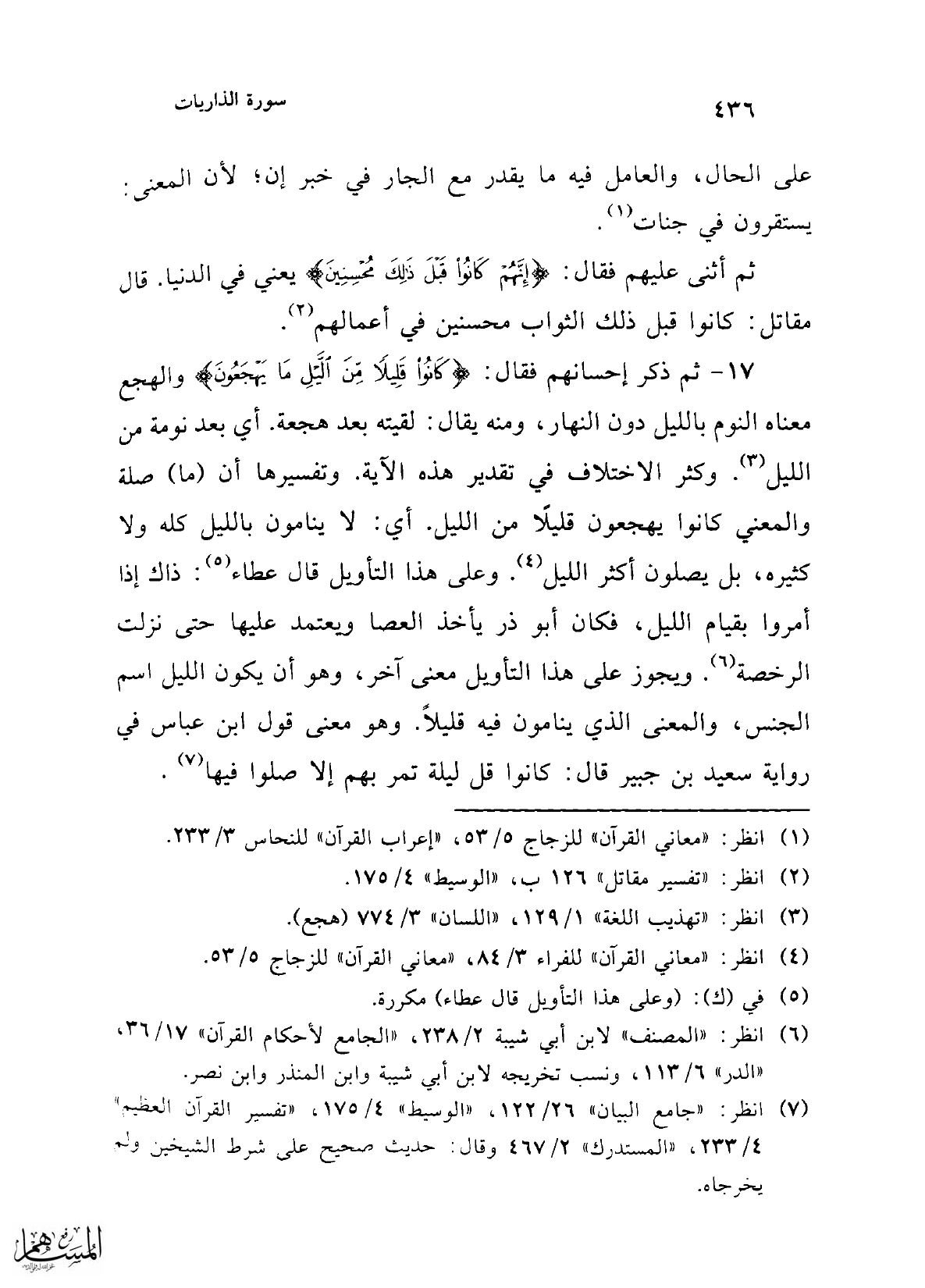 (¬6) انظر: "المصنف" لابن أبي شيبة 2/ 238، "الجامع لأحكام القرآن" 17/ 36, "الدر" 6/ 113، ونسب تخريجه لابن أبي شيبة وابن المنذر وابن نصر.