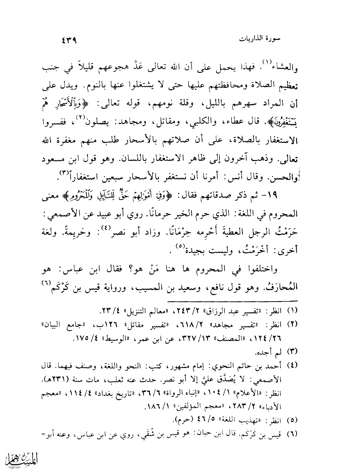 والعشاء (¬1). فهذا يحمل على أن الله تعالى عَدَّ هجوعهم قليلاً في جنب تعظيم الصلاة ومحافظتهم عليها حتى لا يشتغلوا عنها بالنوم. ويدل على أن المراد سهرهم بالليل، وقلة نومهم، قوله تعالى: {وَبِالْأَسْحَارِ هُمْ يَسْتَغْفِرُونَ}. قال عطاء، والكلبي، ومقاتل، ومجاهد: يصلون (¬2)، ففسروا الاستغفار بالصلاة، على أن صلاتهم بالأسحار طلب منهم مغفرة الله تعالى. وذهب آخرون إلى ظاهر الاستغفار باللسان. وهو قول ابن مسعود والحسن. وقال أنس: أمرنا أن نستغفر بالأسحار سبعين استغفاراً (¬3).