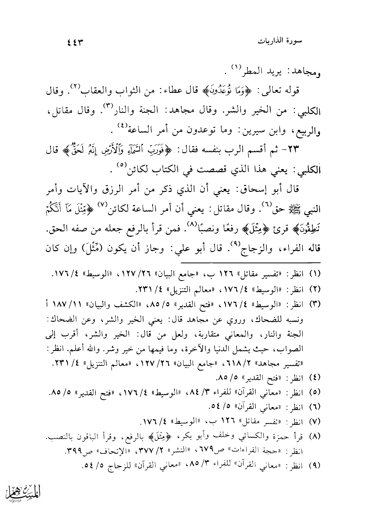 23 - ثم أقسم الرب بنفسه فقال: {فَوَرَبِّ السَّمَاءِ وَالْأَرْضِ إِنَّهُ لَحَقٌّ} قال الكلبي: يعني هذا الذي قصصت في الكتاب لكائن (¬5).