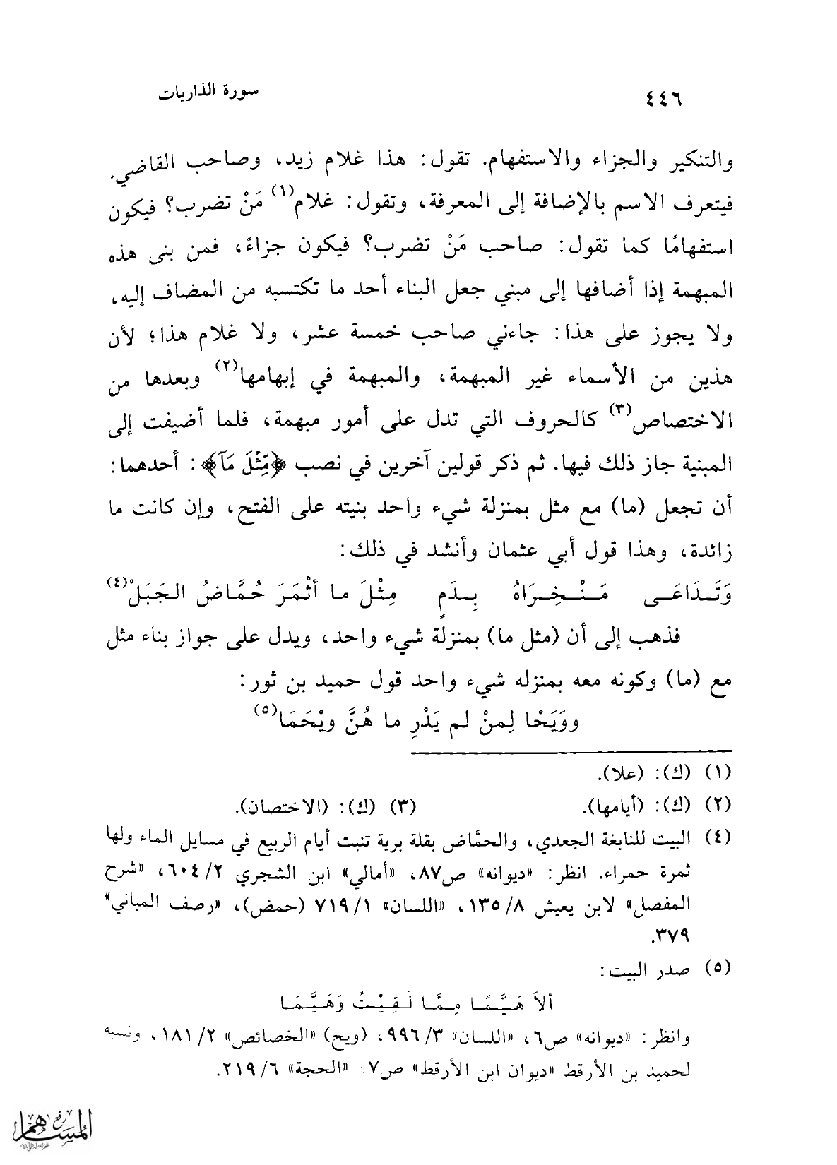 (¬4) البيت للنابغة الجعدي، والحمَّاض بقلة برية تنبت أيام الربيع في مسايل الماء ولها ثمرة حمراء. انظر: "ديوانه" ص 87، "أمالي" ابن الشجري 2/ 604, "شرح المفصل" لابن يعيش 8/ 135، "اللسان" 1/ 719 (حمض)، "رصف المباني" 379.
