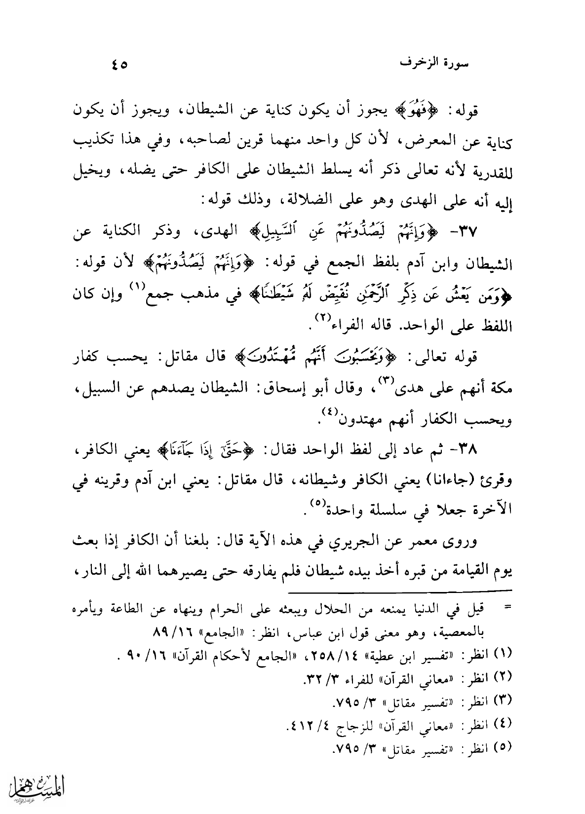 37 - {وَإِنَّهُمْ لَيَصُدُّونَهُمْ عَنِ السَّبِيلِ} الهدى، وذكر الكناية عن الشيطان وابن آدم بلفظ الجمع في قوله: {وَإِنَّهُمْ لَيَصُدُّونَهُمْ} لأن قوله: {وَمَنْ يَعْشُ عَنْ ذِكْرِ الرَّحْمَنِ نُقَيِّضْ لَهُ شَيْطَانًا} في مذهب جمع (¬1) وإن كان اللفظ على الواحد. قاله الفراء (¬2).