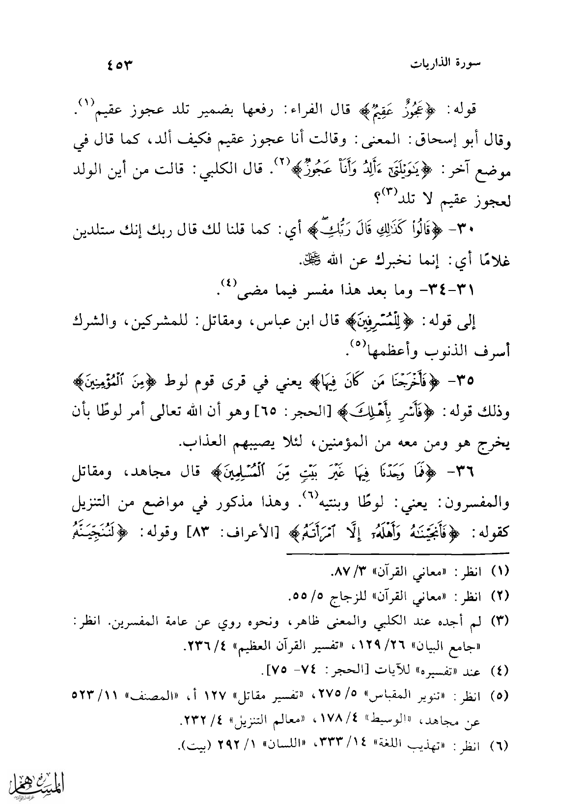 36 - {فَمَا وَجَدْنَا فِيهَا غَيْرَ بَيْتٍ مِنَ الْمُسْلِمِينَ} قال مجاهد، ومقاتل والمفسرون: يعني: لوطًا وبنتيه (¬6). وهذا مذكور في مواضع من التنزيل كقوله: {فَأَنْجَيْنَاهُ وَأَهْلَهُ إِلَّا امْرَأَتَهُ} [الأعراف: 83] وقوله: {لَنُنَجِّيَنَّهُ