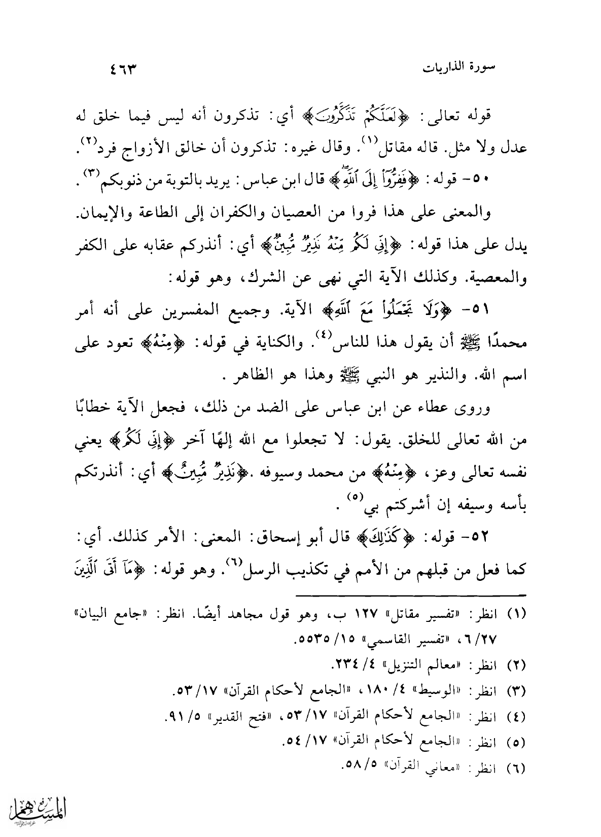 51 - {وَلَا تَجْعَلُوا مَعَ اللهِ} الآية. وجميع المفسرين على أنه أمر محمدًا -صلى الله عليه وسلم- أن يقول هذا للناس (¬4). والكناية في قوله: {مِنْهُ} تعود على اسم الله. والنذير هو النبي -صلى الله عليه وسلم- وهذا هو الظاهر.