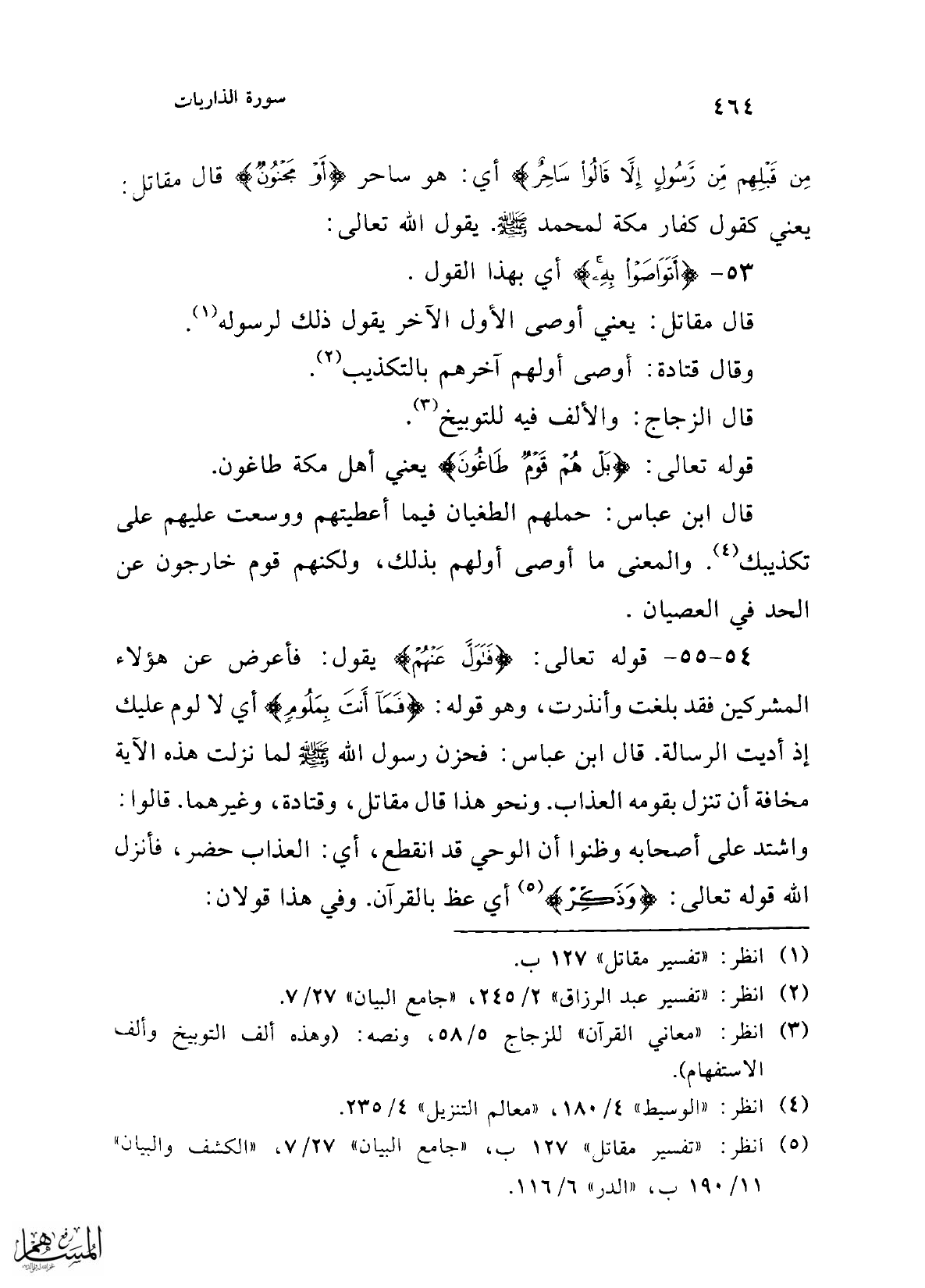 (¬5) انظر: "تفسير مقاتل" 127 ب، "جامع البيان" 27/ 7، "الكشف والبيان" 11/ 190 ب، "الدر" 6/ 116.