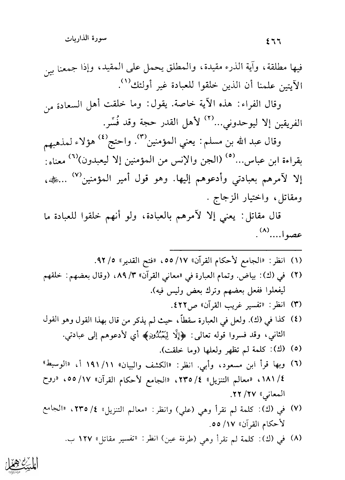 وقال عبد الله بن مسلم: يعني المؤمنين (¬3). واحتج (¬4) هؤلاء لمذهبهم بقراءة ابن عباس ... (¬5) (الجن والإنس من المؤمنين إلا ليعبدون) (¬6) معناه: إلا لآمرهم بعبادتي وأدعوهم إليها. وهو قول أمير المؤمنين (¬7) ... -رضي الله عنه-، ومقاتل، واختيار الزجاج.