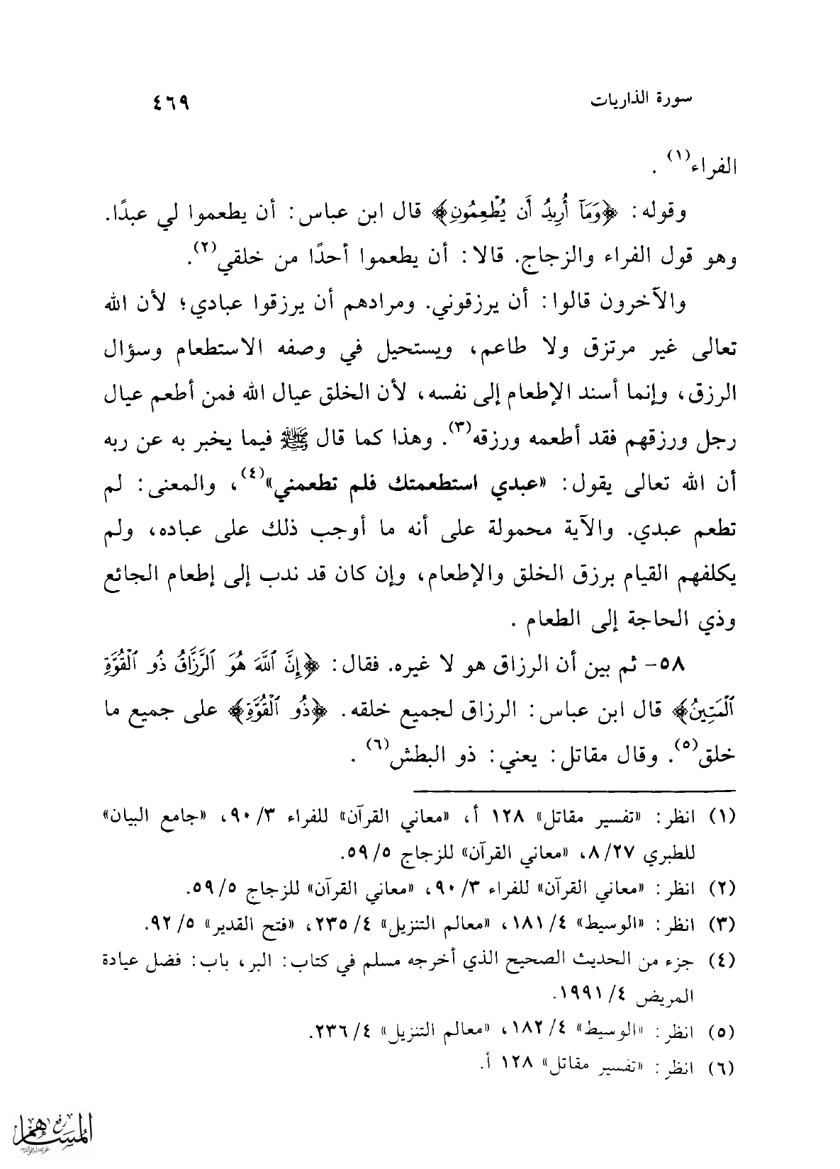 والآخرون قالوا: أن يرزقوني. ومرادهم أن يرزقوا عبادي؛ لأن الله تعالى غير مرتزق ولا طاعم، ويستحيل في وصفه الاستطعام وسؤال الرزق، وإنما أسند الإطعام إلى نفسه؛ لأن الخلق عيال الله فمن أطعم عيال رجل ورزقهم فقد أطعمه ورزقه (¬3). وهذا كما قال -صلى الله عليه وسلم- فيما يخبر به عن ربه أن الله تعالى يقول: "عبدي استطعمتك فلم تطعمني" (¬4)، والمعنى: لم تطعم عبدي. والآية محمولة على أنه ما أوجب ذلك على عباده، ولم يكلفهم القيام برزق الخلق والإطعام، وإن كان قد ندب إلى إطعام الجائع وذي الحاجة إلى الطعام.