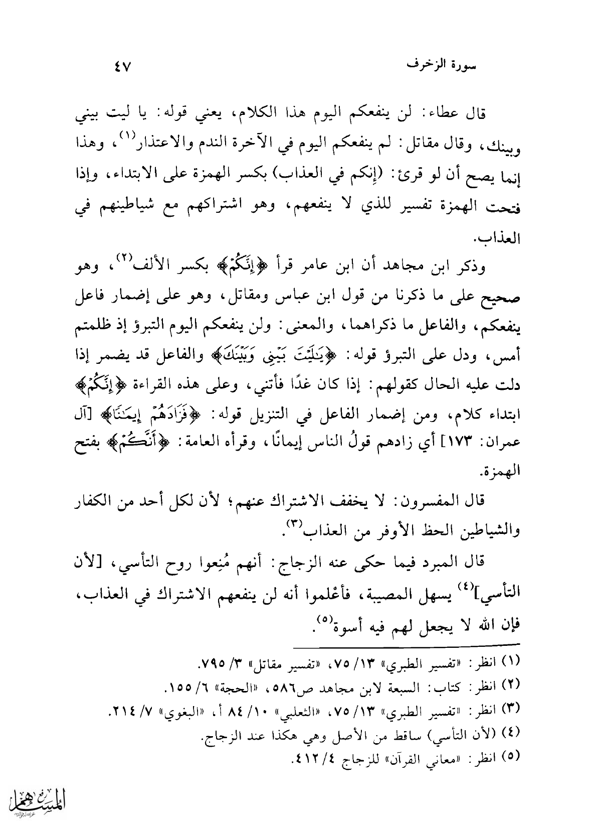 وذكر ابن مجاهد أن ابن عامر قرأ {إِنَّكُمْ} بكسر الألف (¬2)، وهو صحيح على ما ذكرنا من قول ابن عباس ومقاتل، وهو على إضمار فاعل ينفعكم، والفاعل ما ذكراهما، والمعنى: ولن ينفعكم اليوم التبرؤ إذ ظلمتم أمس، ودل على التبرؤ قوله: {يَا لَيْتَ بَيْنِي وَبَيْنَكَ} والفاعل قد يضمر إذا دلت عليه الحال كقولهم: إذا كان غدًا فأتني، وعلى هذه القراءة {إِنَّكُمْ} ابتداء كلام، ومن إضمار الفاعل في التنزيل قوله: {فَزَادَهُمْ إِيمَانًا} [آل عمران: 173] أي زادهم قولُ الناس إيمانًا، وقرأه العامة: {أَنَّكُمْ} بفتح الهمزة.