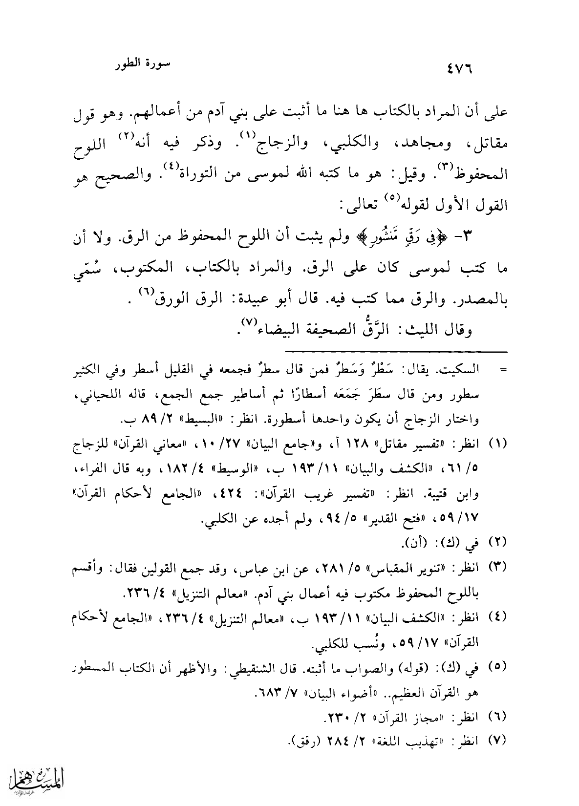(¬5) في (ك): (قوله) والصواب ما أثبته. قال الشنقيطي: والأظهر أن الكتاب المسطور هو القرآن العظيم .. "أضواء البيان" 7/ 683.
