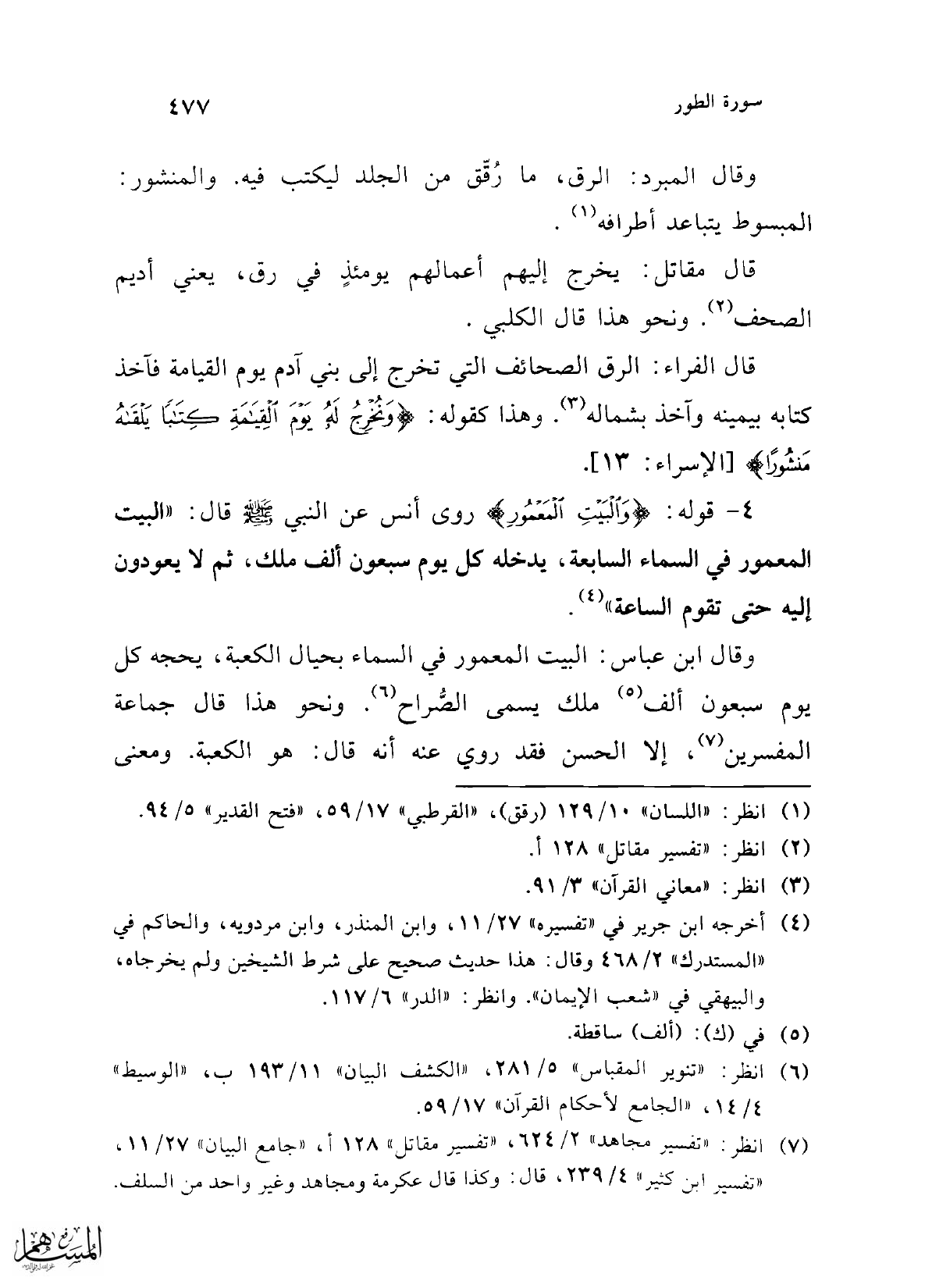 4 - قوله: {وَالْبَيْتِ الْمَعْمُورِ} روى أنس عن النبي -صلى الله عليه وسلم- قال: "البيت المعمور في السماء السابعة، يدخله كل يوم سبعون ألف ملك، ثم لا يعودون إليه حتى تقوم الساعة" (¬4).