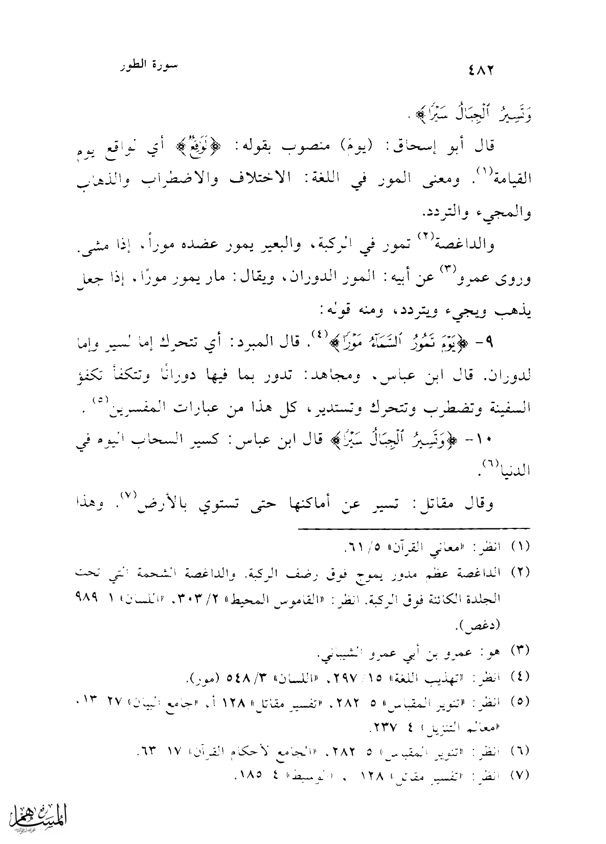 9 - {يَوْمَ تَمُورُ السَّمَاءُ مَوْرًا} (¬4). قال المبرد: أي تتحرك إما لسير وإما لدوران. قال ابن عباس، ومجاهد: تدور بما فيها دورانًا وتتكفأ تكفؤ السفينة وتضطرب وتتحرك وتستدير، كل هذا من عبارات المفسرين (¬5).