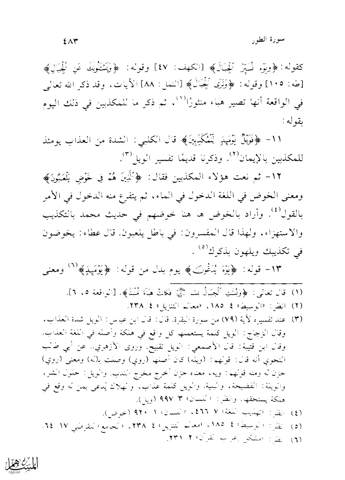 11 - {فَوَيْلٌ يَوْمَئِذٍ لِلْمُكَذِّبِينَ} قال الكلبي: الشدة من العذاب يومئذ للمكذبين بالإيمان (¬2). وذكرنا قديمًا تفسير الويل (¬3).