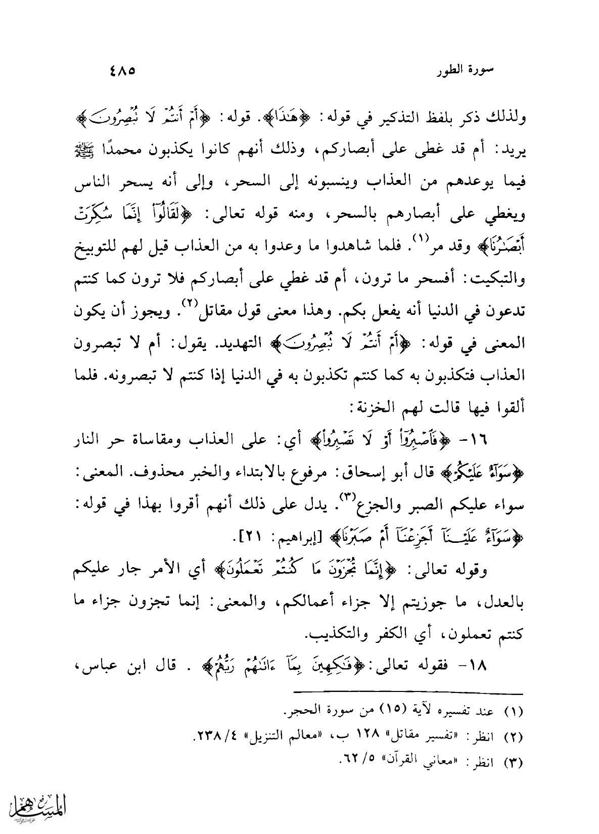 16 - {فَاصْبِرُوا أَوْ لَا تَصْبِرُوا} أي: على العذاب ومقاساة حر النار {سَوَاءٌ عَلَيْكُم} قال أبو إسحاق: مرفوع بالابتداء والخبر محذوف. المعنى: سواء عليكم الصبر والجزع (¬3). يدل على ذلك أنهم أقروا بهذا في قوله: {سَوَاءٌ عَلَيْنَا أَجَزِعْنَا أَمْ صَبَرْنَا} [إبراهيم: 21].