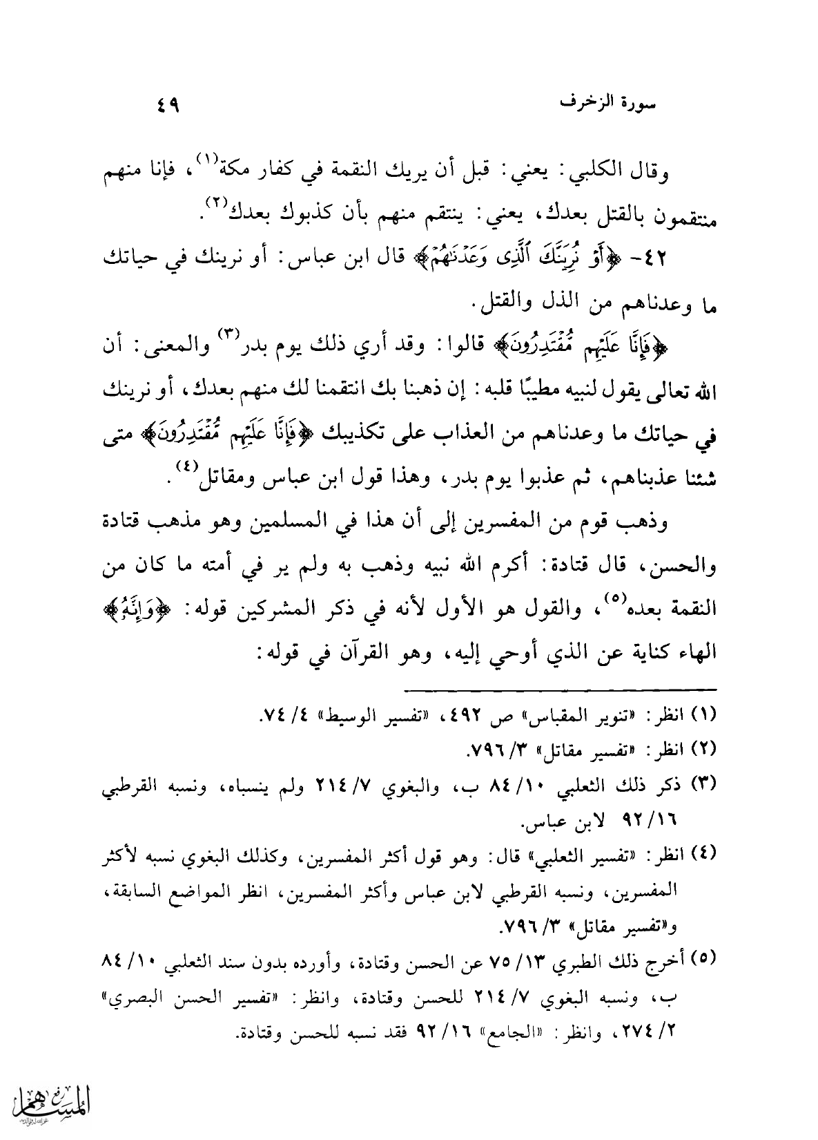 42 - {أَوْ نُرِيَنَّكَ الَّذِي وَعَدْنَاهُمْ} قال ابن عباس: أو نرينك في حياتك ما وعدناهم من الذل والقتل.
