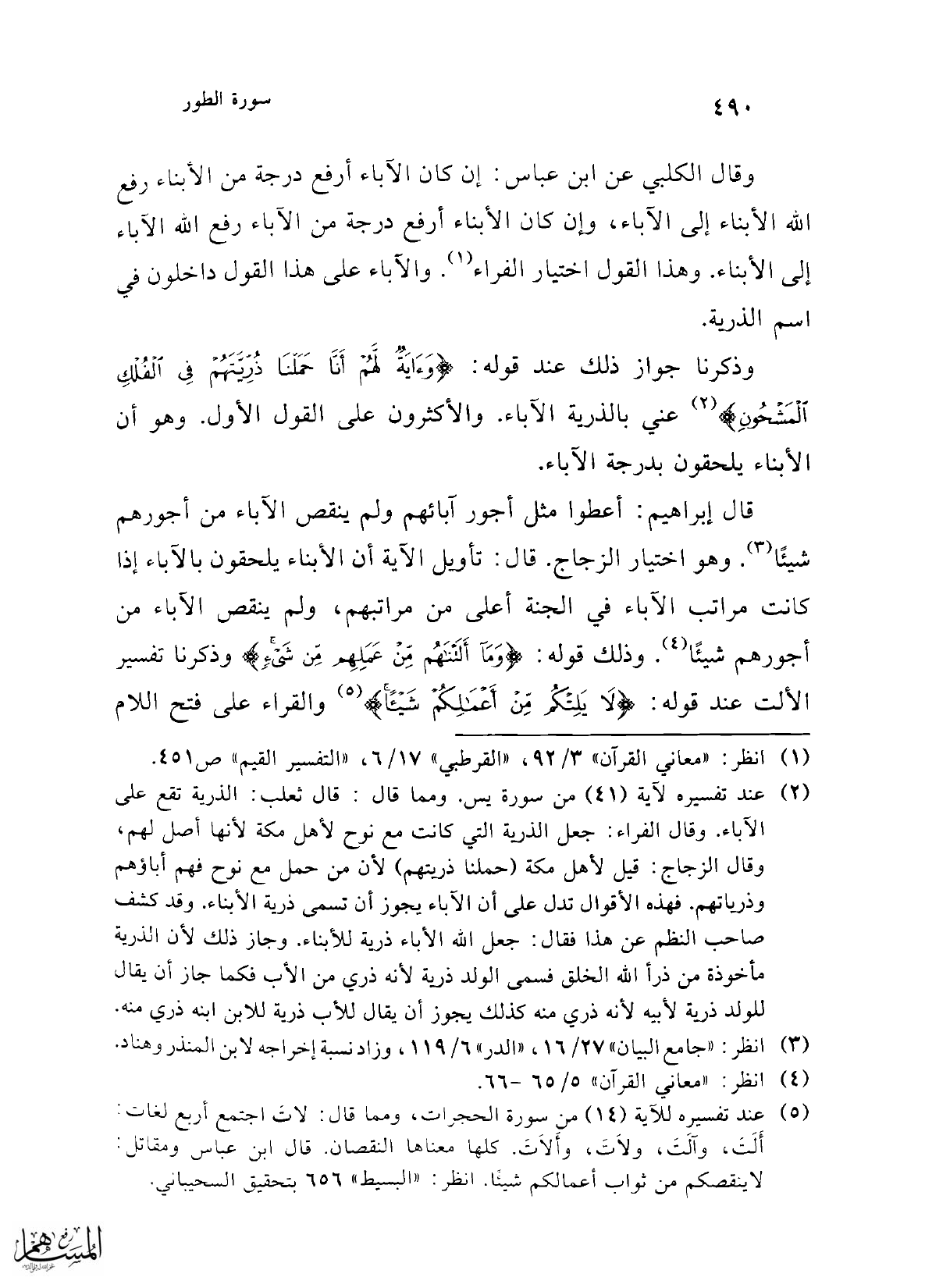 قال إبراهيم: أعطوا مثل أجور آبائهم ولم ينقص الآباء من أجورهم شيئًا (¬3). وهو اختيار الزجاج. قال: تأويل الآية أن الأبناء يلحقون بالآباء إذا كانت مراتب الآباء في الجنة أعلى من مراتبهم، ولم ينقص الآباء من أجورهم شيئًا (¬4). وذلك قوله: {وَمَا أَلَتْنَاهُمْ مِنْ عَمَلِهِمْ مِنْ شَيْءٍ} وذكرنا تفسير الألت عند قوله: {لَا يَلِتْكُمْ مِنْ أَعْمَالِكُمْ شَيْئًا} (¬5) والقراء على فتح اللام