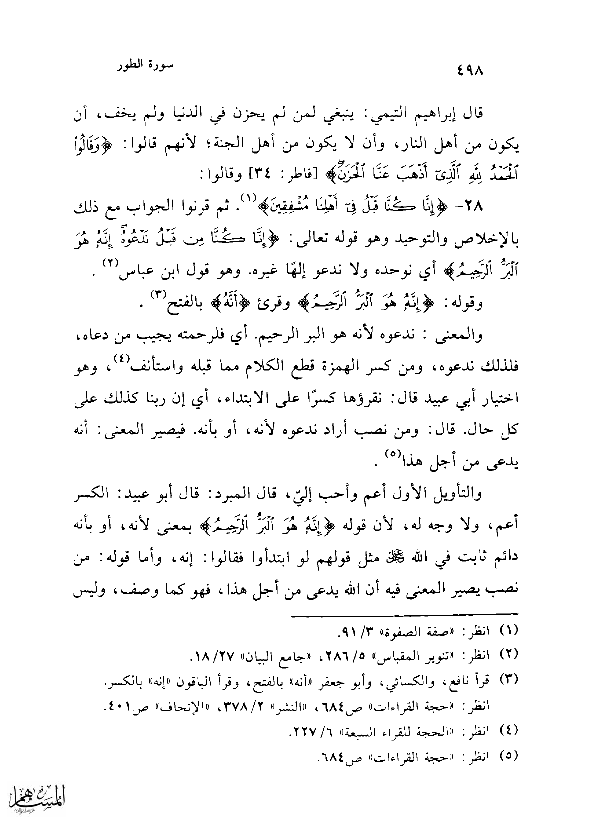 والتأويل الأول أعم وأحب إليّ، قال المبرد: قال أبو عبيد: الكسر أعم، ولا وجه له؛ لأن قوله {إِنَّهُ هُوَ الْبَرُّ الرَّحِيمُ} بمعنى لأنه، أو بأنه دائم ثابت في الله -عز وجل- مثل قولهم لو ابتدأوا فقالوا: إنه، وأما قوله: من نصب يصير المعنى فيه أن الله يدعى من أجل هذا، فهو كما وصف، وليس