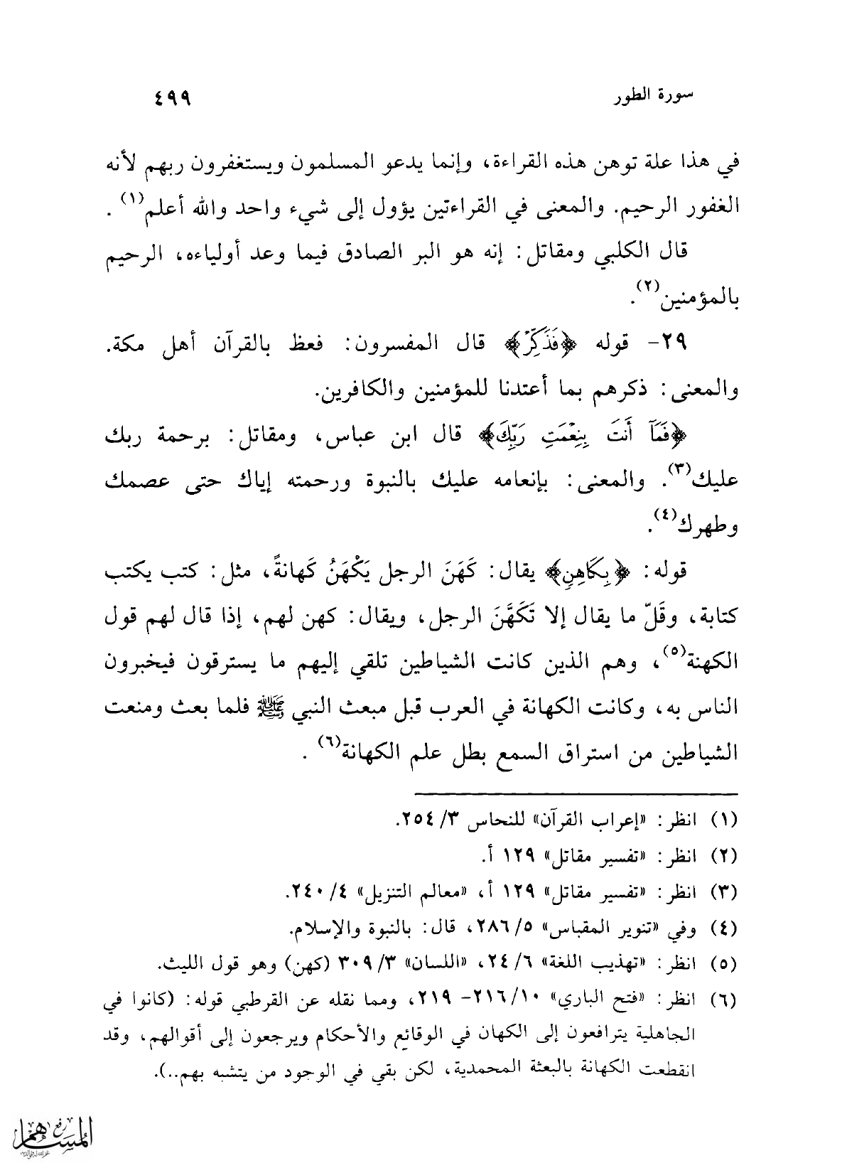 (¬6) انظر: "فتح الباري" 10/ 216 - 219، ومما نقله عن القرطبي قوله: (كانوا في الجاهلية يترافعون إلى الكهان في الوقائع والأحكام ويرجعون إلى أقوالهم، وقد انقطت الكهانة بالبعثة المحمدية، لكن بقي في الوجود من يتشبه بهم ..).