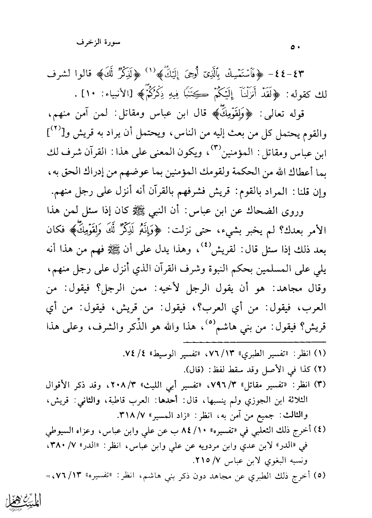 قوله تعالى: {وَلِقَوْمِكَ} قال ابن عباس ومقاتل: لمن آمن منهم، والقوم يحتمل كل من بعث إليه من الناس، ويحتمل أن يراد به قريش و [(¬2)] ابن عباس ومقاتل: المؤمنين (¬3)، ويكون المعنى على هذا: القرآن شرف لك بما أعطاك الله من الحكمة ولقومك المؤمنين بما عوضهم من إدراك الحق به، وإن قلنا: المراد بالقوم: قريش فشرفهم بالقرآن أنه أنزل على رجل منهم.