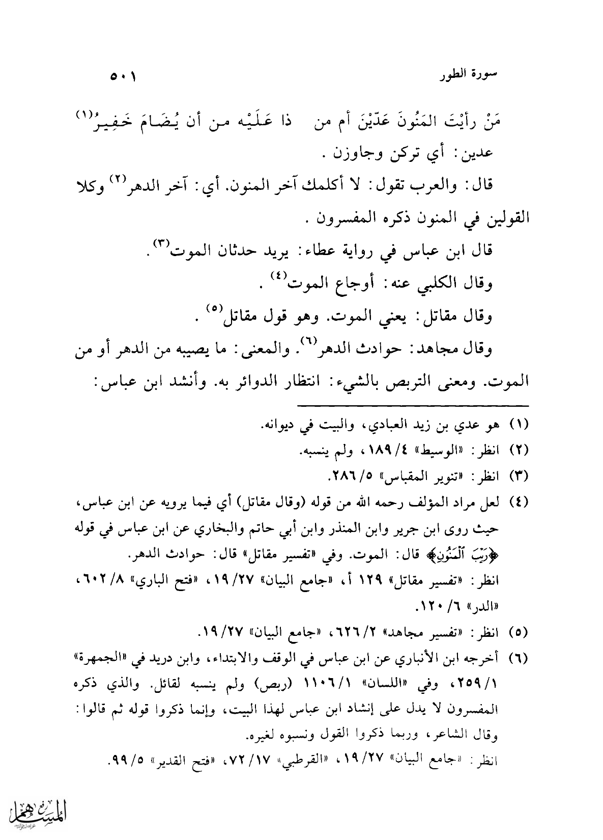 (¬4) لعل مراد المؤلف رحمه الله من قوله (وقال مقاتل) أي فيما يرويه عن ابن عباس، حيث روى ابن جرير وابن المنذر وابن أبي حاتم والبخاري عن ابن عباس في قوله {رَيْبَ الْمَنُونِ} قال: الموت. وفي "تفسير مقاتل" قال: حوادث الدهر.
