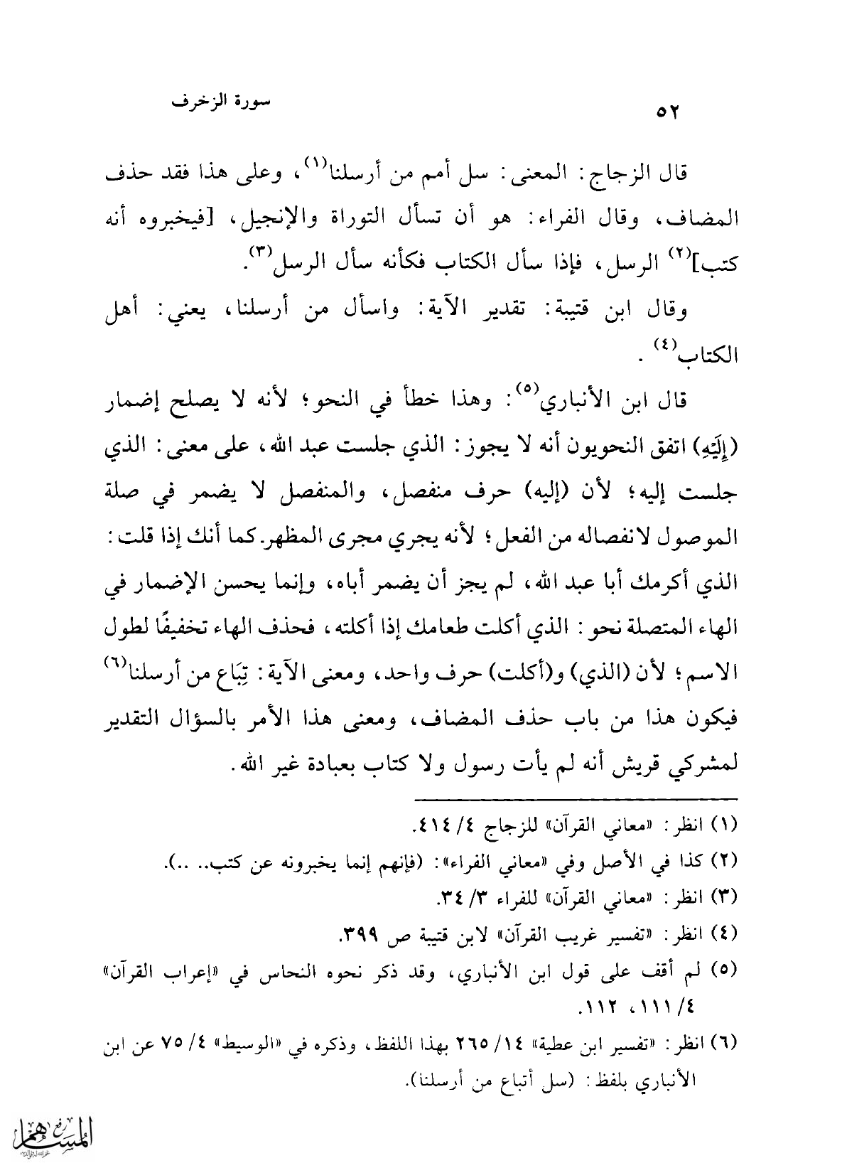 قال ابن الأنباري (¬5): وهذا خطأ في النحو؛ لأنه لا يصلح إضمار (إِلَيْهِ) اتفق النحويون أنه لا يجوز: الذي جلست عبد الله، على معنى: الذي جلست إليه؛ لأن (إليه) حرف منفصل، والمنفصل لا يضمر في صلة الموصول لانفصاله من الفعل؛ لأنه يجري مجرى المظهر. كما أنك إذا قلت: الذي أكرمك أبا عبد الله، لم يجز أن يضمر أباه، وإنما يحسن الإضمار في الهاء المتصلة نحو: الذي أكلت طعامك إذا أكلته، فحذف الهاء تخفيفًا لطول الاسم؛ لأن (الذي) و (أكلت) حرف واحد، ومعنى الآية: تِبَاع من أرسلنا (¬6) فيكون هذا من باب حذف المضاف، ومعنى هذا الأمر بالسؤال التقدير لمشركي قريش أنه لم يأت رسول ولا كتاب بعبادة غير الله.