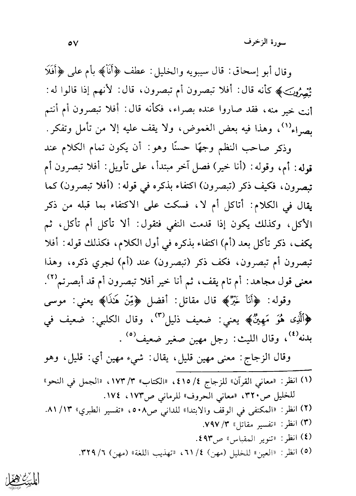 وقال أبو إسحاق: قال سيبويه والخليل: عطف {أَنَا} بأم على {أَفَلَا تُبْصِرُونَ} كأنه قال: أفلا تبصرون أم تبصرون، قال: لأنهم إذا قالوا له: أنت خير منه، فقد صاروا عنده بصراء، فكأنه قال: أفلا تبصرون أم أنتم بصراء (¬1)، وهذا فيه بعض الغموض، ولا يقف عليه إلا من تأمل وتفكر.