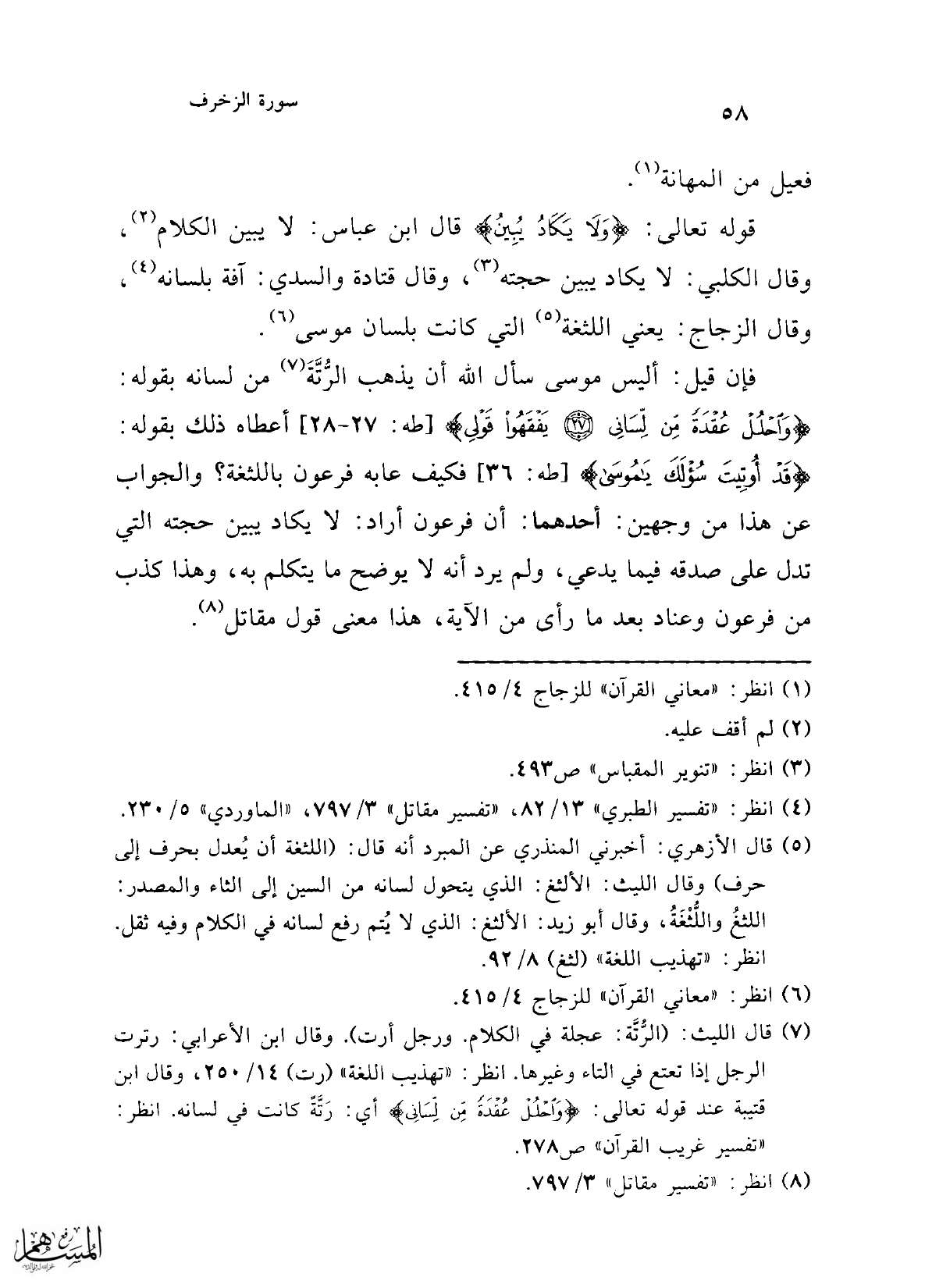قوله تعالى: {وَلَا يَكَادُ يُبِينُ} قال ابن عباس: لا يبين الكلام (¬2)، وقال الكلبي: لا يكاد يبين حجته (¬3)، وقال قتادة والسدي: آفة بلسانه (¬4)، وقال الزجاج: يعني اللثغة (¬5) التي كانت بلسان موسى (¬6).