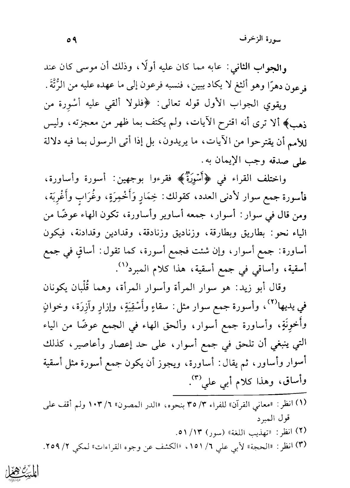 واختلف القراء في {أَسْوِرَةٌ} فقرءوا بوجهين: أسورة وأساورة، فأسورة جمع سوار لأدنى العدد، كقولك: خِمَارٍ وَأَخْمِرَةٍ، وغُرَابٍ وأَغْرِبَة، ومن قال في سوار: أسوار، جمعه أساوير وأساورة، تكون الهاء عوضًا من الياء نحو: بطاريق وبطارقة، وزناديق وزنادقة، وقدادين وقدادنة، فيكون أساورة: جمع أسوار، وإن شئت فجمع أسورة، كما تقول: أساقٍ في جمع أسقية، وأساقي في جمع أسقية، هذا كلام المبرد (¬1).