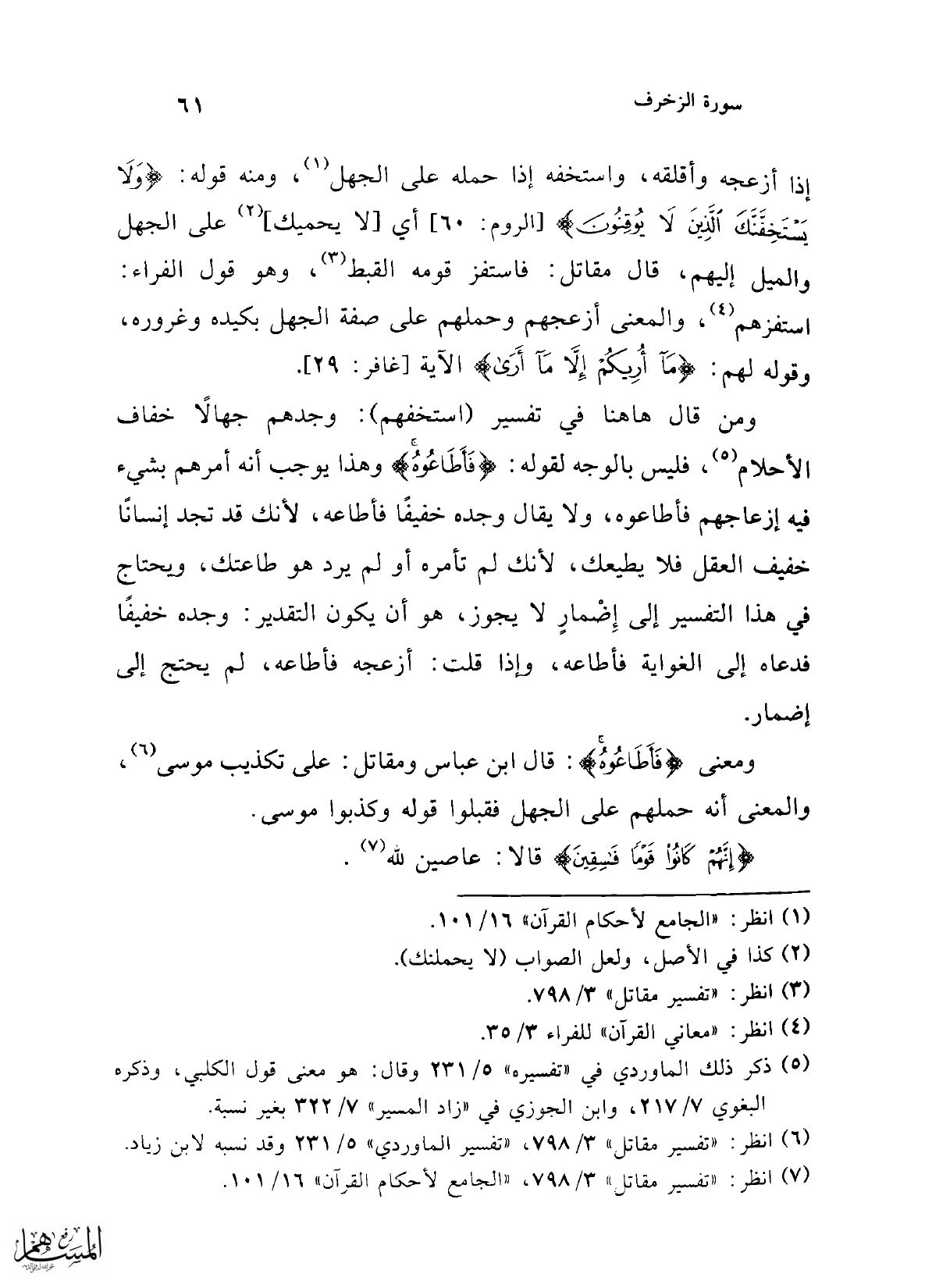 ومن قال هاهنا في تفسير (استخفهم): وجدهم جهالاً خفاف الأحلام (¬5)، فليس بالوجه لقوله: {فَأَطَاعُوهُ} وهذا يوجب أنه أمرهم بشيء فيه إزعاجهم فأطاعوه، ولا يقال وجده خفيفًا فأطاعه, لأنك قد تجد إنساناً خفيف العقل فلا يطيعك, لأنك لم تأمره أو لم يرد هو طاعتك، ويحتاج في هذا التفسير إلى إِضْمارٍ لا يجوز، هو أن يكون التقدير: وجده خفيفًا فدعاه إلى الغواية فأطاعه، وإذا قلت: أزعجه فأطاعه، لم يحتج إلى إضمار.