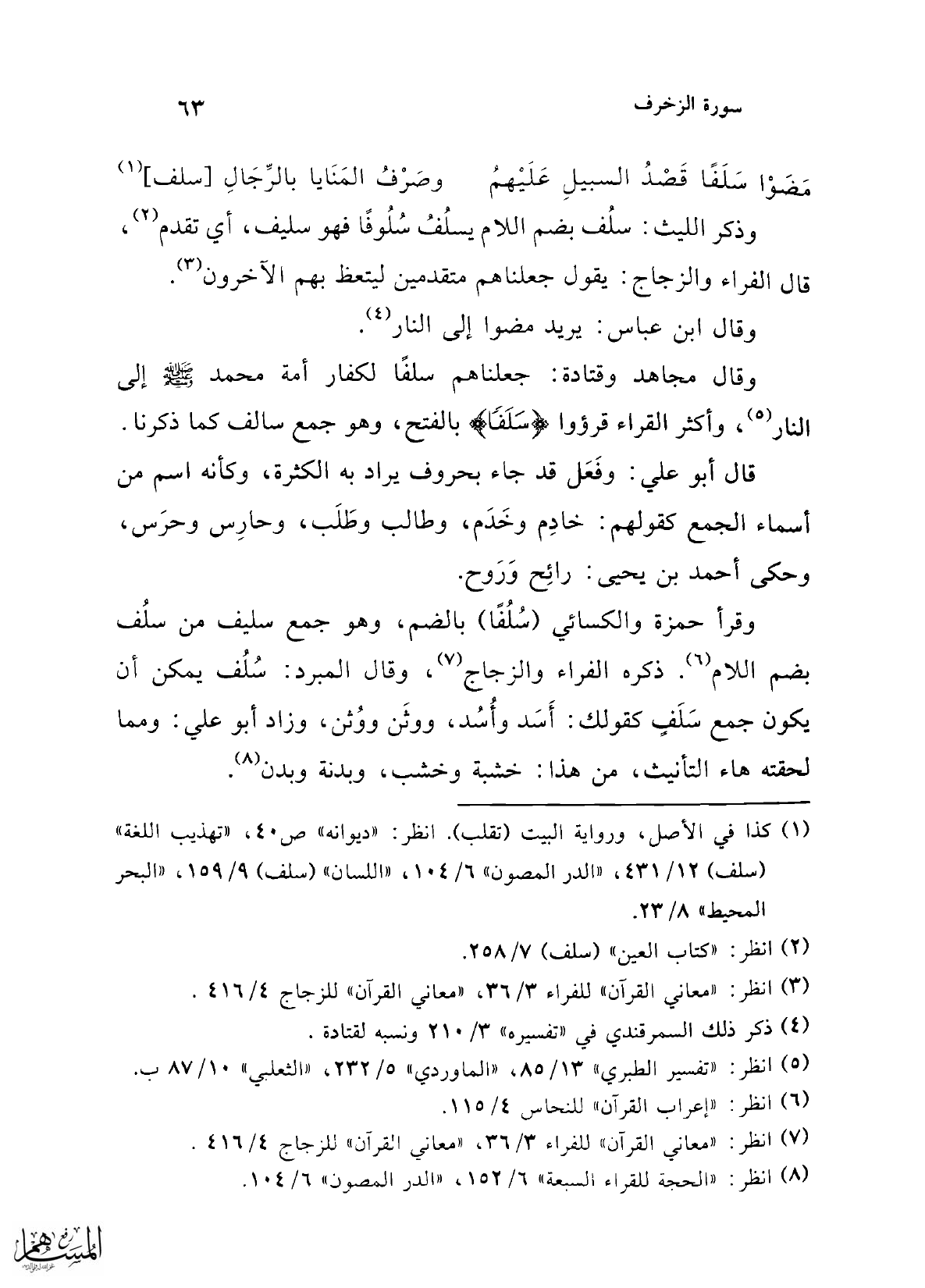 وقرأ حمزة والكسائي (سُلُفًا) بالضم، وهو جمع سليف من سلُف بضم اللام (¬6). ذكره الفراء والزجاج (¬7)، وقال المبرد: سُلُف يمكن أن يكون جمع سَلَفٍ كقولك: أَسَد وأُسُد، ووثَن ووُثن، وزاد أبو علي: ومما لحقته هاء التأنيث، من هذا: خشبة وخشب، وبدنة وبدن (¬8).
