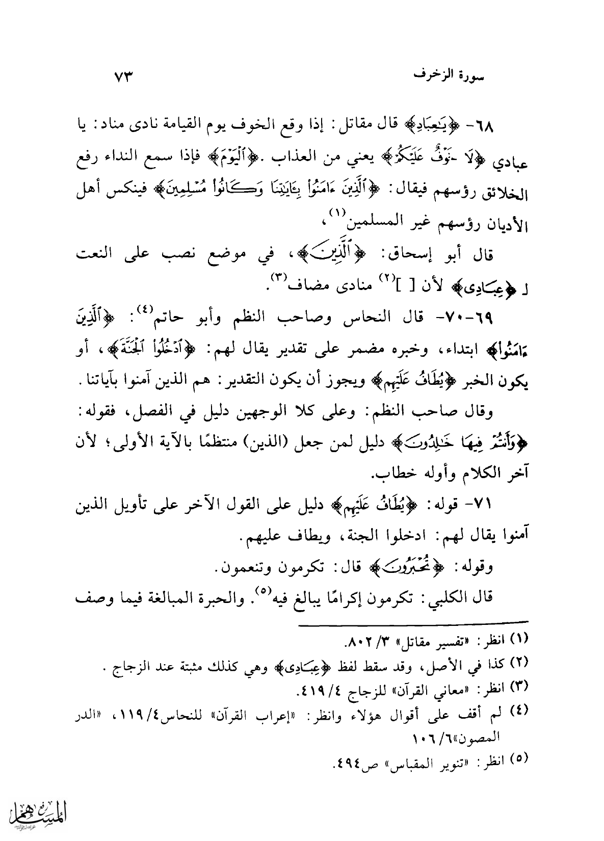 68 - {يَا عِبَادِ} قال مقاتل: إذا وقع الخوف يوم القيامة نادى مناد: يا عبادي {لَا خَوْفٌ عَلَيْكُمُ} يعني من العذاب. {الْيَوْمَ} فإذا سمع النداء رفع الخلائق رؤسهم فيقال: {الَّذِينَ آمَنُوا بِآيَاتِنَا وَكَانُوا مُسْلِمِينَ} فينكس أهل الأديان رؤسهم غير المسلمين (¬1)،