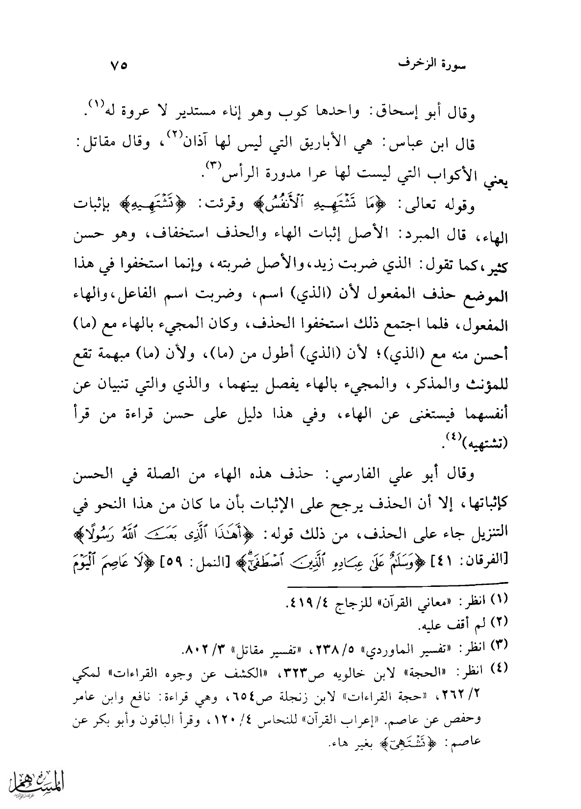(¬4) انظر: "الحجة" لابن خالويه ص 323، "الكشف عن وجوه القراءات" لمكي 2/ 262، "حجة القراءات" لابن زنجلة ص 654، وهي قراءة: نافع وابن عامر وحفص عن عاصم. "إعراب القرآن" للنحاس 4/ 120، وقرأ الباقون وأبو بكر عن عاصم: {تَشْتَهِي} بغير هاء.