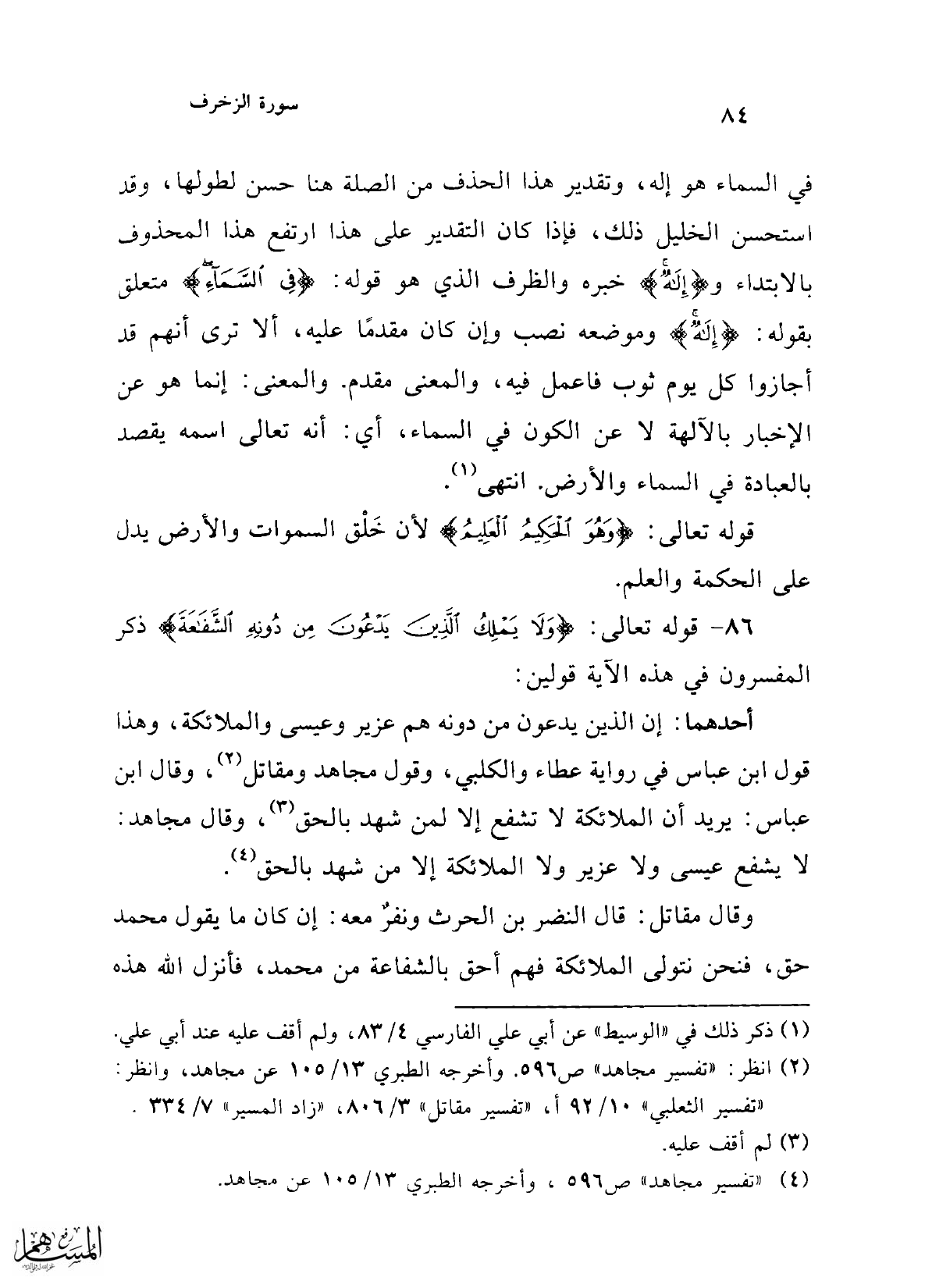 86 - قوله تعالى: {وَلَا يَمْلِكُ الَّذِينَ يَدْعُونَ مِنْ دُونِهِ الشَّفَاعَةَ} ذكر المفسرون في هذه الآية قولين: