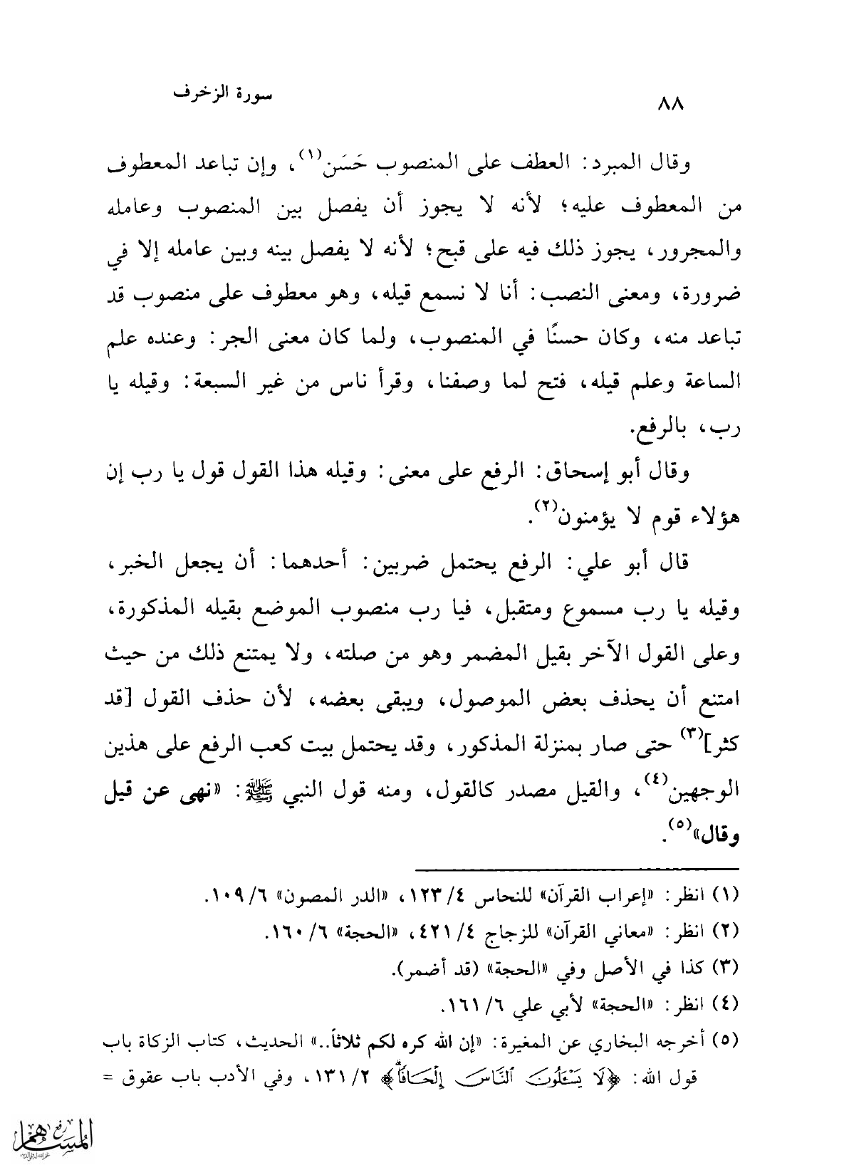 وقال المبرد: العطف على المنصوب حَسَن (¬1)، وإن تباعد المعطوف من المعطوف عليه؛ لأنه لا يجوز أن يفصل بين المنصوب وعامله والمجرور، يجوز ذلك فيه على قبح؛ لأنه لا يفصل بينه وبين عامله إلا في ضرورة، ومعنى النصب: أنا لا نسمع قيله، وهو معطوف على منصوب قد تباعد منه، وكان حسنًا في المنصوب، ولما كان معنى الجر: وعنده علم الساعة وعلم قيله، فتح لما وصفنا، وقرأ ناس من غير السبعة: وقيله يا رب، بالرفع.