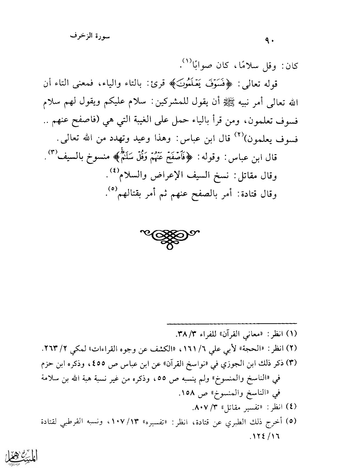 قال ابن عباس: وقوله: {فَاصْفَحْ عَنْهُمْ وَقُلْ سَلَامٌ} منسوخ بالسيف (¬3).