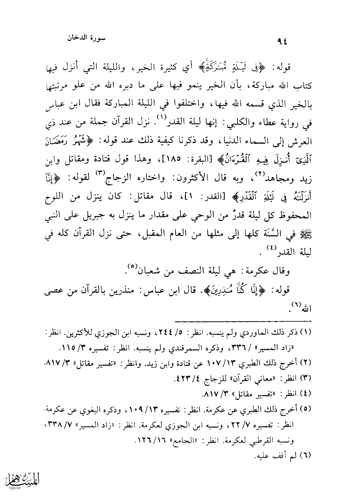قوله: {فِي لَيْلَةٍ مُبَارَكَةٍ} أي كثيرة الخير، والليلة التي أنزل فيها كتاب الله مباركة، بأن الخير ينمو فيها على ما دبره الله من علو مرتبتها بالخير الذي قسمه الله فيها، واختلفوا في الليلة المباركة فقال ابن عباس في رواية عطاء والكلبي: إنها ليلة القدر (¬1). نزل القرآن جملة من عند ذي العرش إلى السماء الدنيا، وقد ذكرنا كيفية ذلك عند قوله: {شَهْرُ رَمَضَانَ الَّذِي أُنْزِلَ فِيهِ الْقُرْآنُ} [البقرة: 185]، وهذا قول قتادة ومقاتل وابن زيد ومجاهد (¬2)، وبه قال الأكثرون: واختاره الزجاج (¬3) لقوله: {إِنَّا أَنْزَلْنَاهُ فِي لَيْلَةِ الْقَدْرِ} [القدر: 1]، قال مقاتل: كان ينزل من اللوح المحفوظ كل ليلة قدرٌ من الوحي على مقدار ما ينزل به جبريل على النبي -صلى الله عليه وسلم- في السَّنَة كلها إلى مثلها من العام المقبل، حتى نزل القرآن كله في ليلة القدر (¬4).