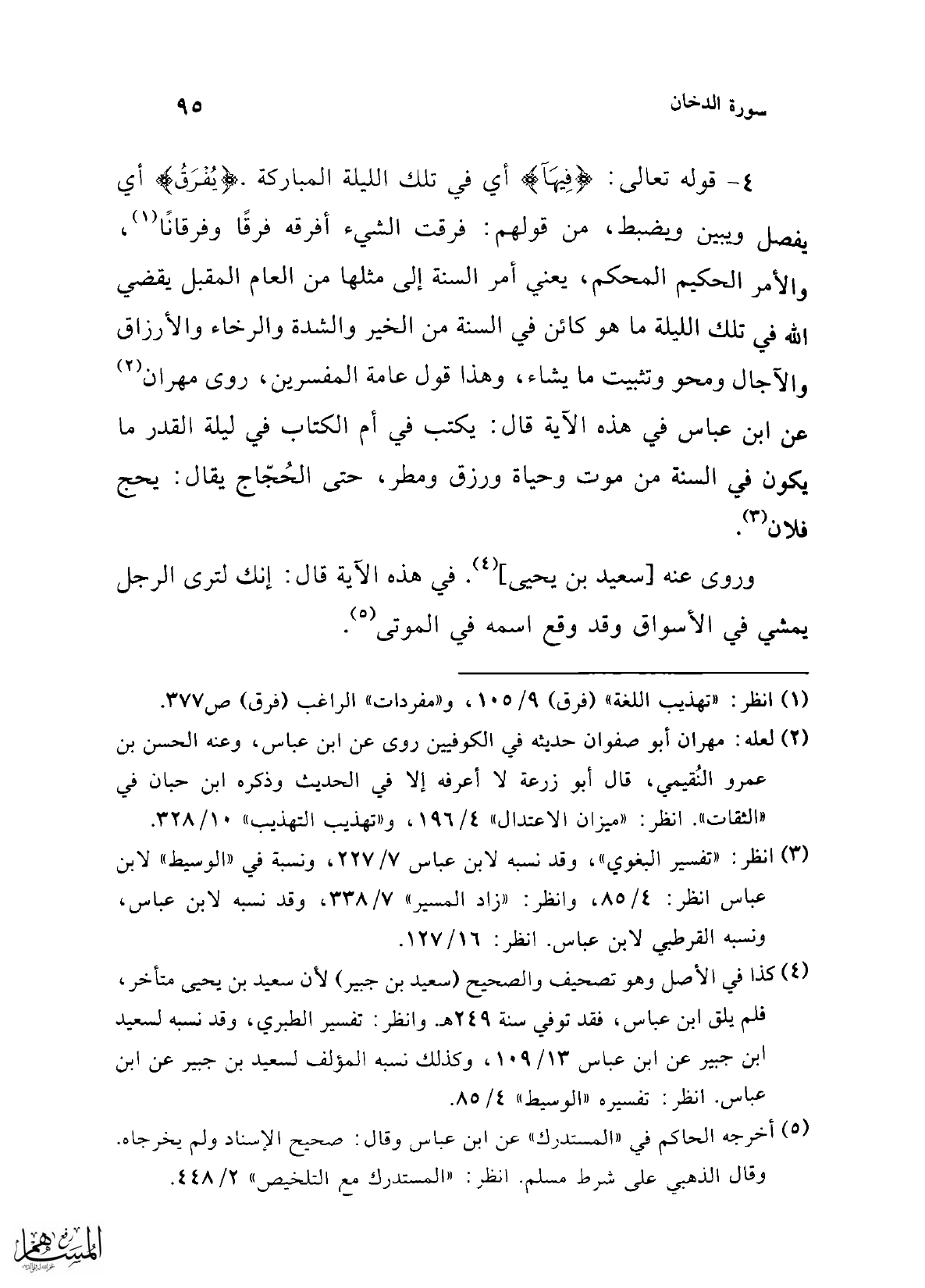 4 - قوله تعالى: {فِيهَا} أي في تلك الليلة المباركة. {يُفْرَقُ} أي يفصل ويبين ويضبط، من قولهم: فرقت الشيء أفرقه فرقاً وفرقاناً (¬1) , والأمر الحكيم المحكم، يعني أمر السنة إلى مثلها من العام المقبل يقضي الله في تلك الليلة ما هو كائن في السنة من الخير والشدة والرخاء والأرزاق والآجال ومحو وتثبيت ما يشاء، وهذا قول عامة المفسرين، روى مهران (¬2) عن ابن عباس في هذه الآية قال: يكتب في أم الكتاب في ليلة القدر ما يكون في السنة من موت وحياة ورزق ومطر، حتى الحُجّاج يقال: يحج فلان (¬3).
