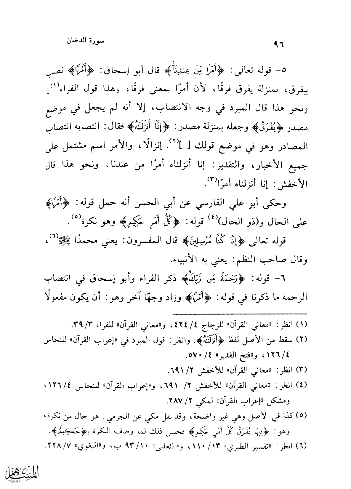(¬5) كذا في الأصل وهي غير واضحة، وقد نقل مكي عن الجرمي: هو حال من نكرة، وهو: {فِيهَا يُفْرَقُ كُلُّ أَمْرٍ حَكِيمٍ} فحسن ذلك لما وصف النكرة بـ {حَكِيمٍ}.