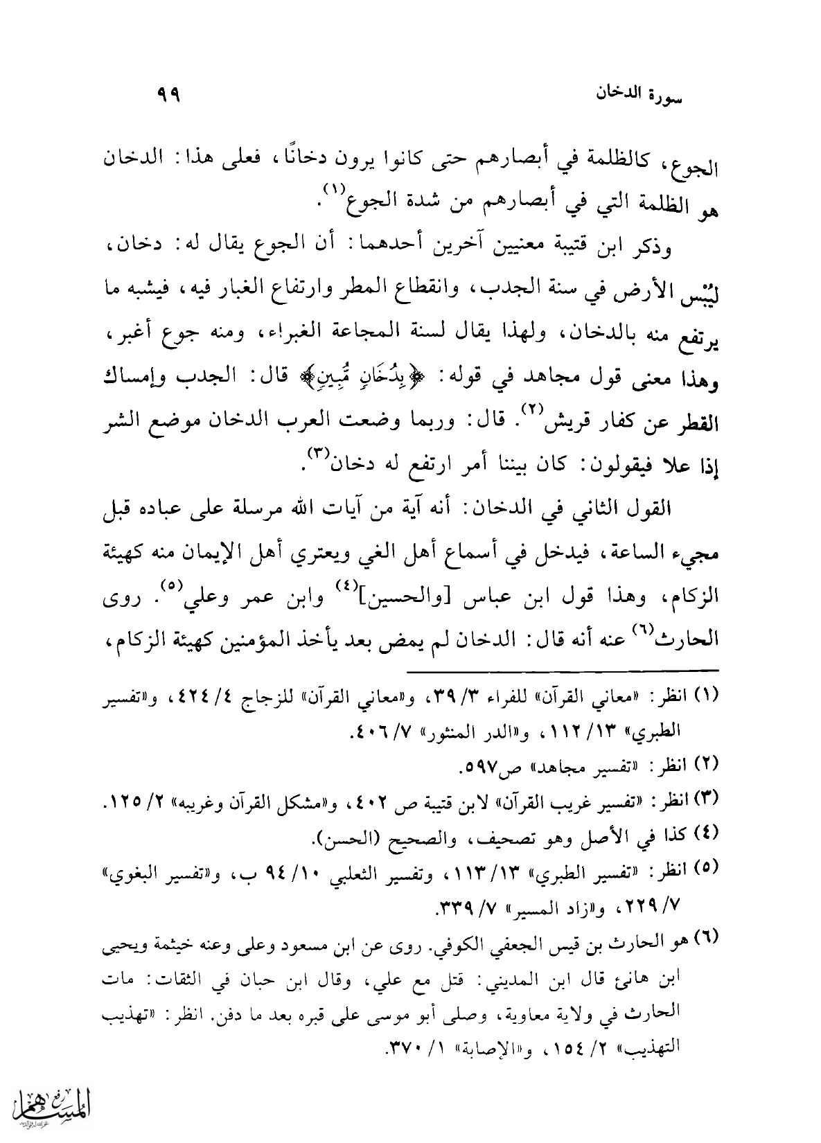 القول الثاني في الدخان: أنه آية من آيات الله مرسلة على عباده قبل مجيء الساعة، فيدخل في أسماع أهل الغي ويعتري أهل الإيمان منه كهيئة الزكام، وهذا قول ابن عباس [والحسين] (¬4) وابن عمر وعلي (¬5). روى الحارث (¬6) عنه أنه قال: الدخان لم يمض بعد يأخذ المؤمنين كهيئة الزكام،