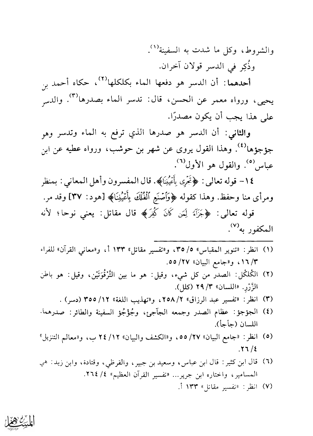 أحدهما: أن الدسر هو دفعها الماء بكلكلها (¬2)، حكاه أحمد بن يحيى، ورواه معمر عن الحسن، قال: تدسر الماء بصدرها (¬3). والدسر على هذا يجب أن يكون مصدرًا.
