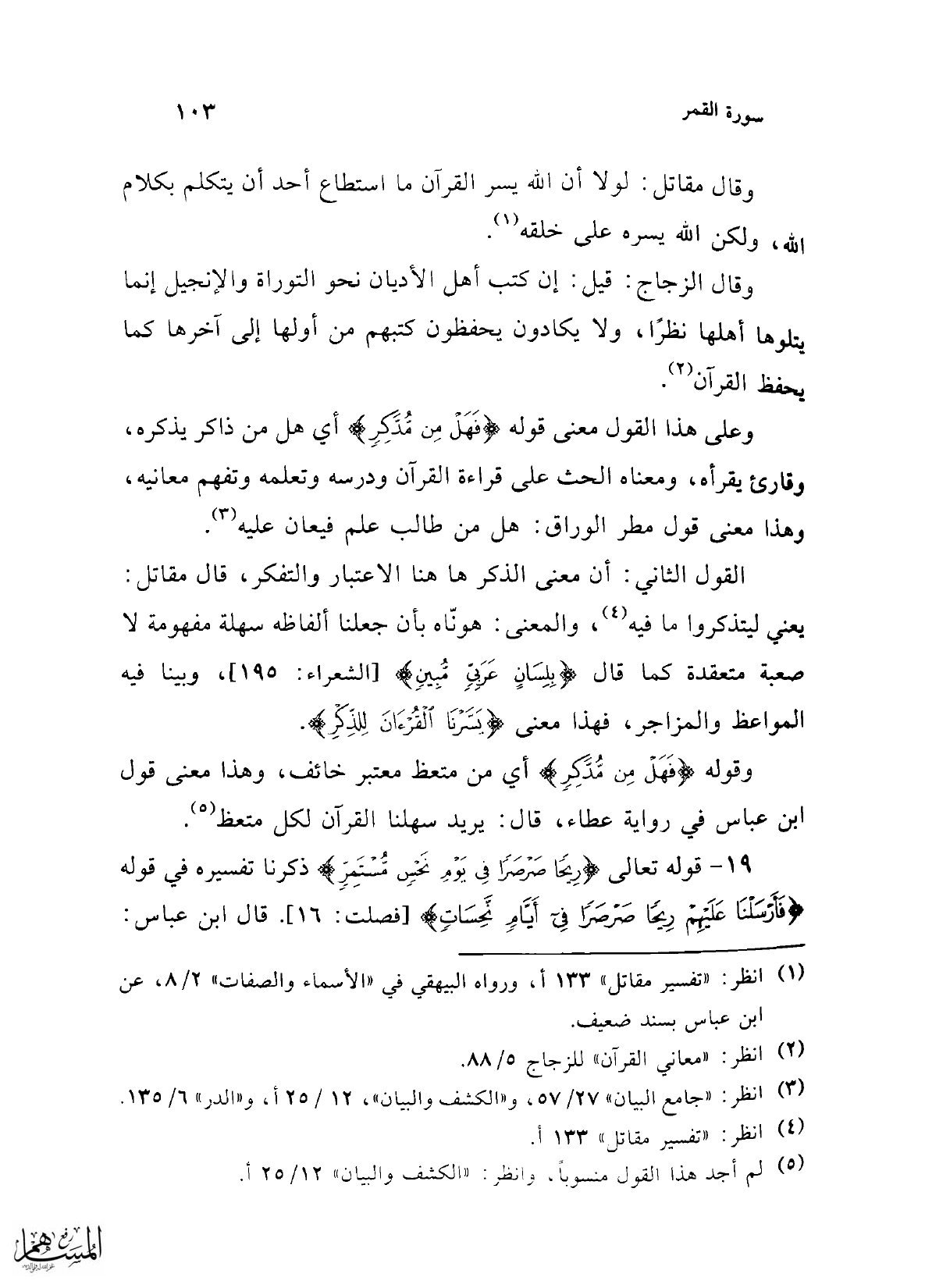 وعلى هذا القول معنى قوله {فَهَلْ مِنْ مُدَّكِرٍ} أي هل من ذاكر يذكره، وقارئ يقرأه، ومعناه الحث على قراءة القرآن ودرسه وتعلمه وتفهم معانيه، وهذا معنى قول مطر الوراق: هل من طالب علم فيعان عليه (¬3).