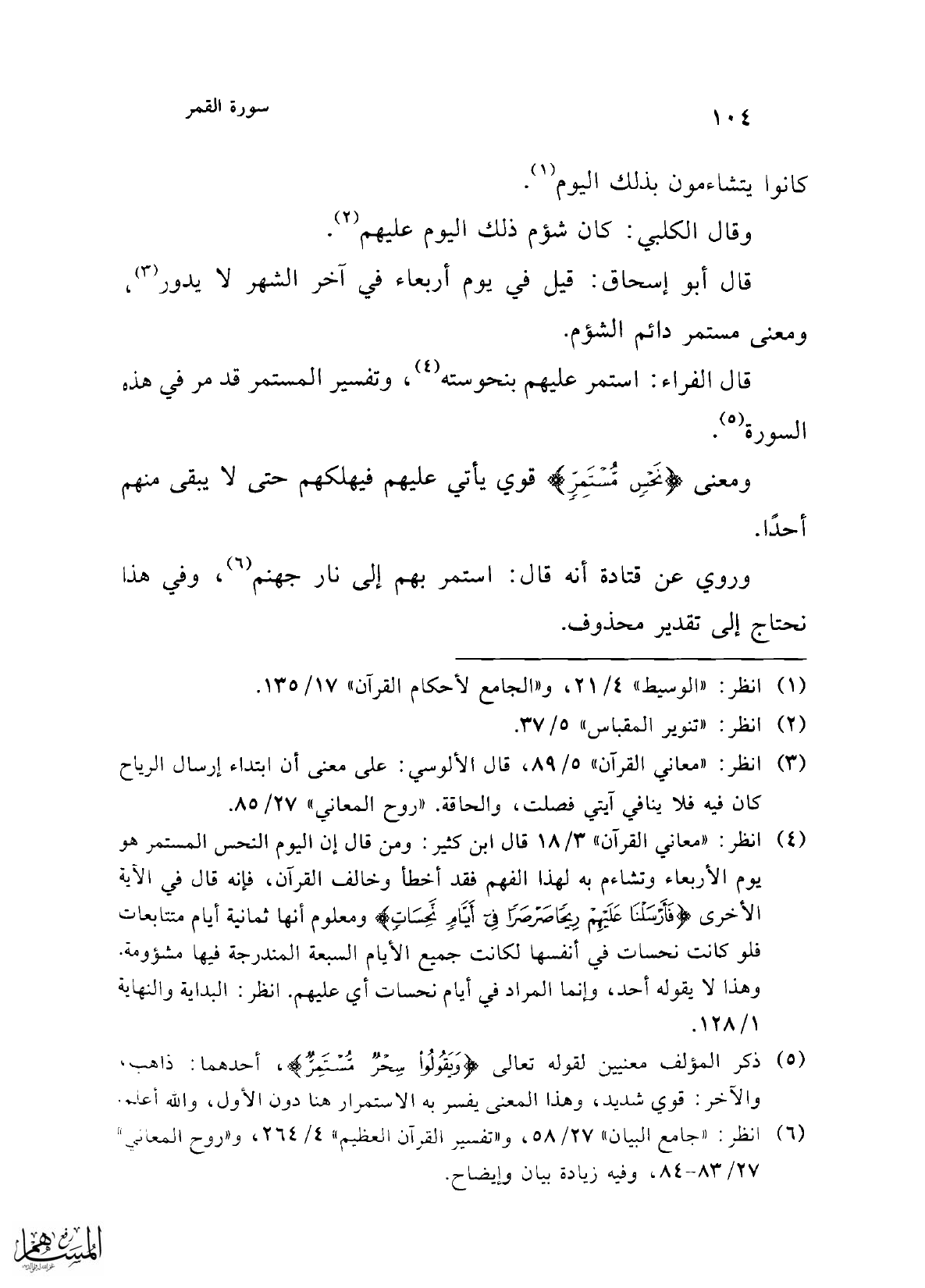 (¬4) انظر: "معاني القرآن" 3/ 18 قال ابن كثير: ومن قال إن اليوم النحس المستمر هو يوم الأربعاء وتشاءم به لهذا اللهم فقد أخطأ وخالف القرآن، فإنه قال في الآية الأخرى {فَأَرْسَلْنَا عَلَيْهِمْ رِيحًا صَرْصَرًا فِي أَيَّامٍ نَحِسَاتٍ} ومعلوم أنها ثمانية أيام متتابعات فلو كانت نحسات في أنفسها لكانت جميع الأيام السبعة المندرجة فيها مشؤومة. وهذا لا يقوله أحد، وإنما المراد في أيام نحسات أي عليهم. انظر: البداية والنهاية 1/ 128.