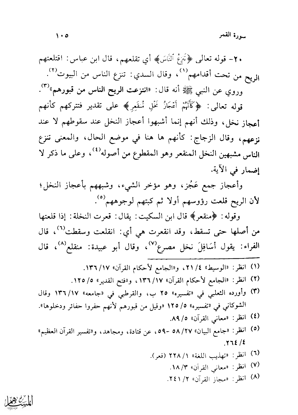 وقوله: {مُنْقَعِرٍ} قال ابن السكيت: يقال: قعرت النخلة: إذا قلعتها من أصلها حتى تسقط، وقوإنقعرت هي أي: انقلعت وسقطت (¬6)، قال الفراء: يقول أسَافِلَ نخل مصرع (¬7)، وقال أبو عبيدة: منقلع (¬8)، قال