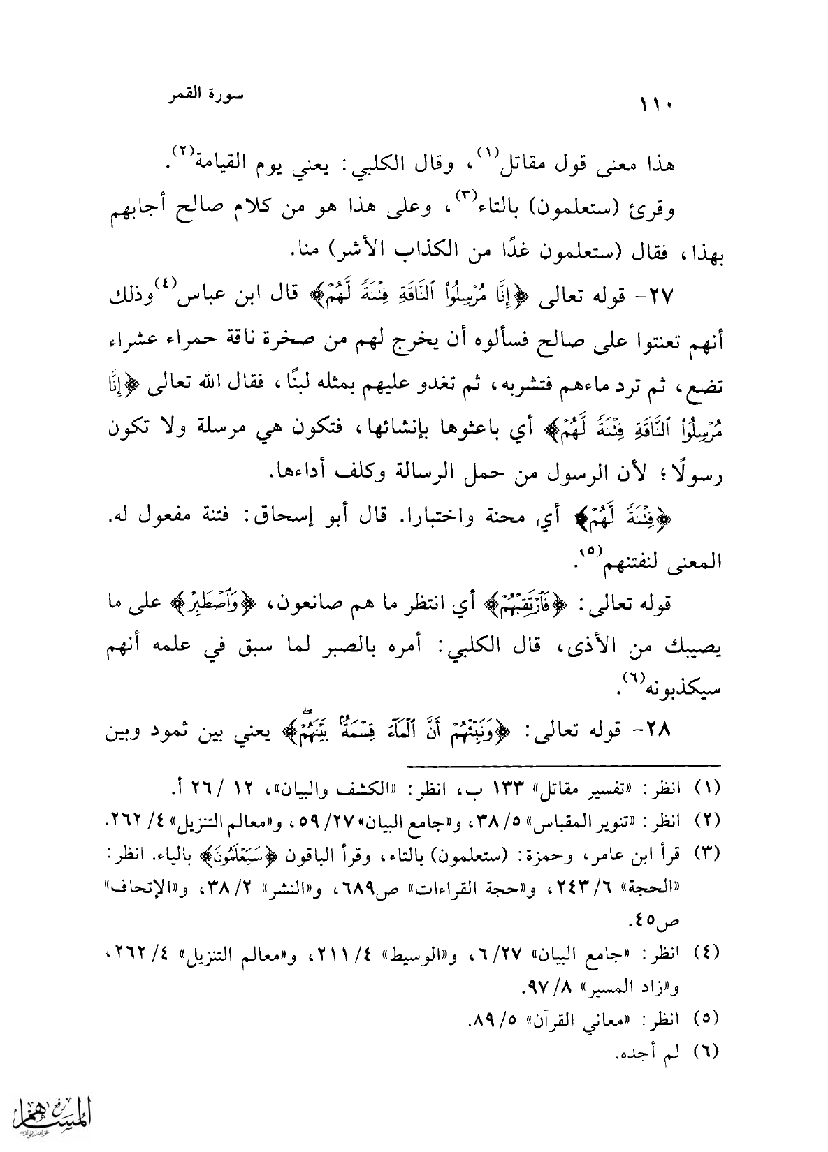 27 - قوله تعالى {إِنَّا مُرْسِلُو النَّاقَةِ فِتْنَةً} قال ابن عباس (¬4) وذك أنهم تعنتوا على صالح فسألوه أن يخرج لهم من صخرة ناقة حمراء عشراء تضع، ثم ترد ماءهم فتشربه، ثم تغدو عليهم بمثله لبناً، فقال الله تعالى {إِنَّا مُرْسِلُو النَّاقَةِ فِتْنَةً لَهُمْ} أي باعثوها بإنشائها، فتكون هي مرسلة ولا تكون رسولاً؛ لأن الرسول من حمل الرسالة وكلف أداءها.