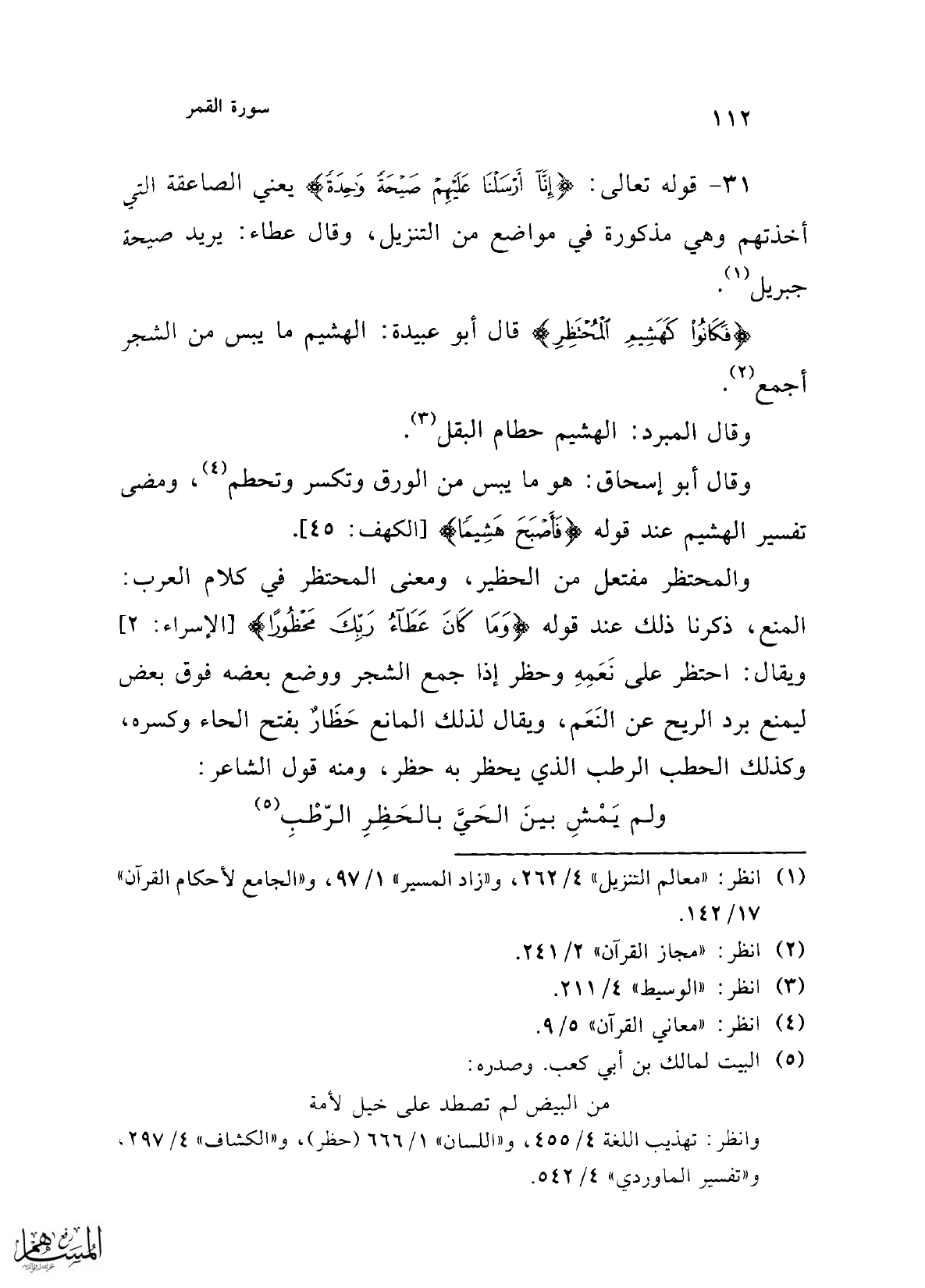 {فَكَانُوا كَهَشِيمِ الْمُحْتَظِرِ} قال أبو عبيدة: الهشيم ما يبس من الشجر أجمع (¬2).