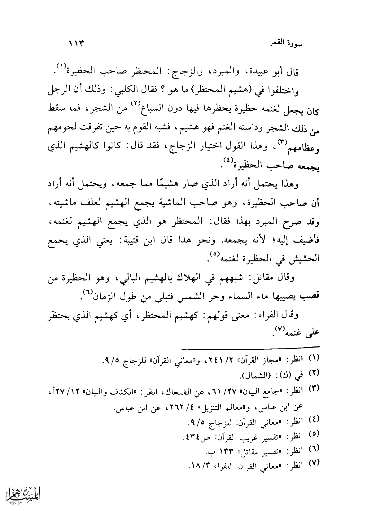 واختلفوا في (هشيم المحتظر) ما هو؟ فقال الكلبي: وذلك أن الرجل كان يجعل لغنمه حظيرة يحظرها فيها دون السباع (¬2) من الشجر، فما سقط من ذلك الشجر وداسته الغنم فهو هشيم، فشبه القوم به حين فرقت حومهم وعظامهم (¬3)، وهذا القول اختيار الزجاج، فقد قال: كانوا كالهشيم الذي يجمعه صاحب الحظيرة (¬4).