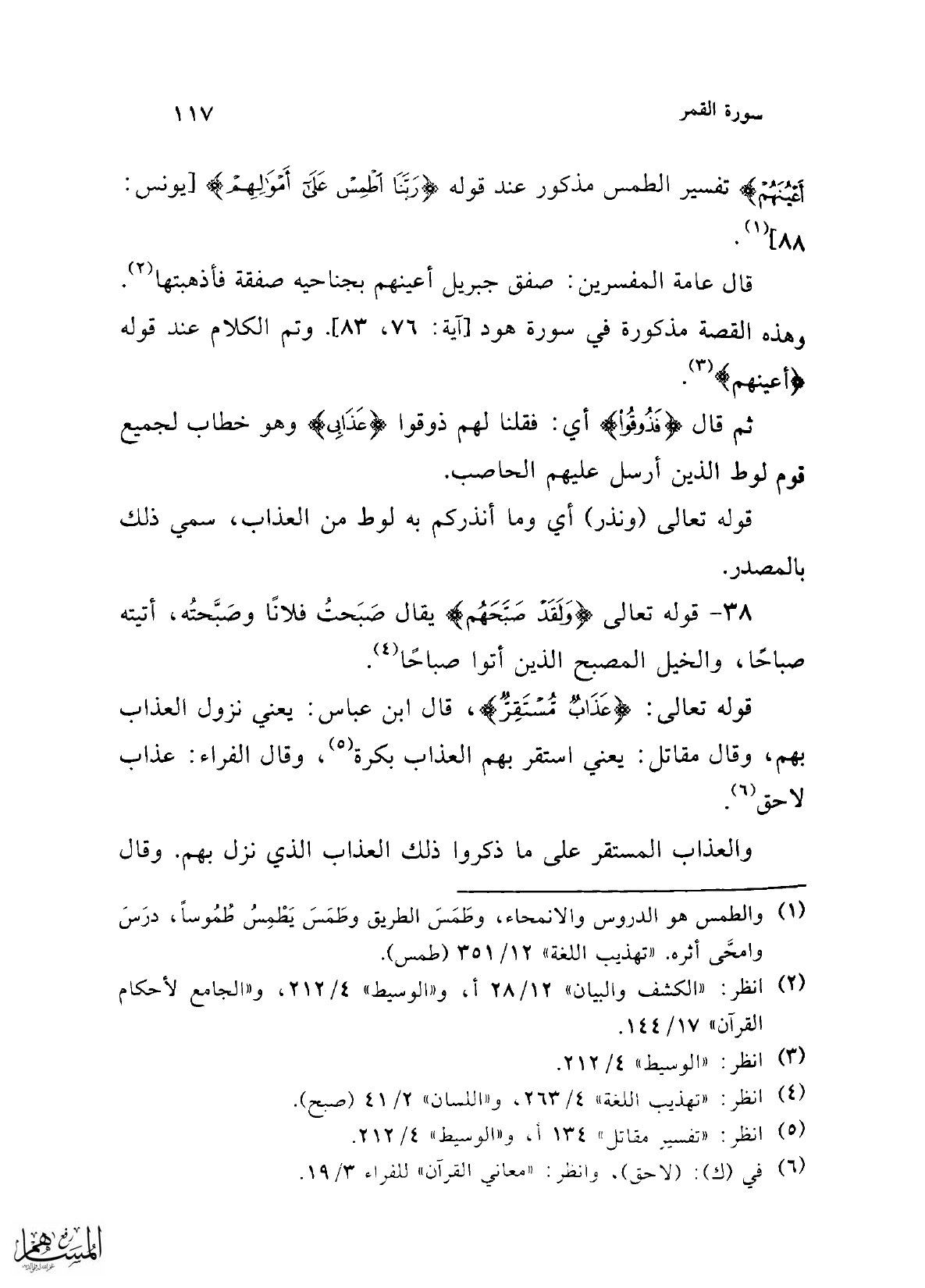 قال عامة المفسرين: صفق جبريل أعينهم بجناحيه صفقة فأذهبتها (¬2). وهذه القصة مذكورة في سورة هود [آية: 76، 83]. وتم الكلام عند قوله {أَعْيُنَهُمْ} (¬3).