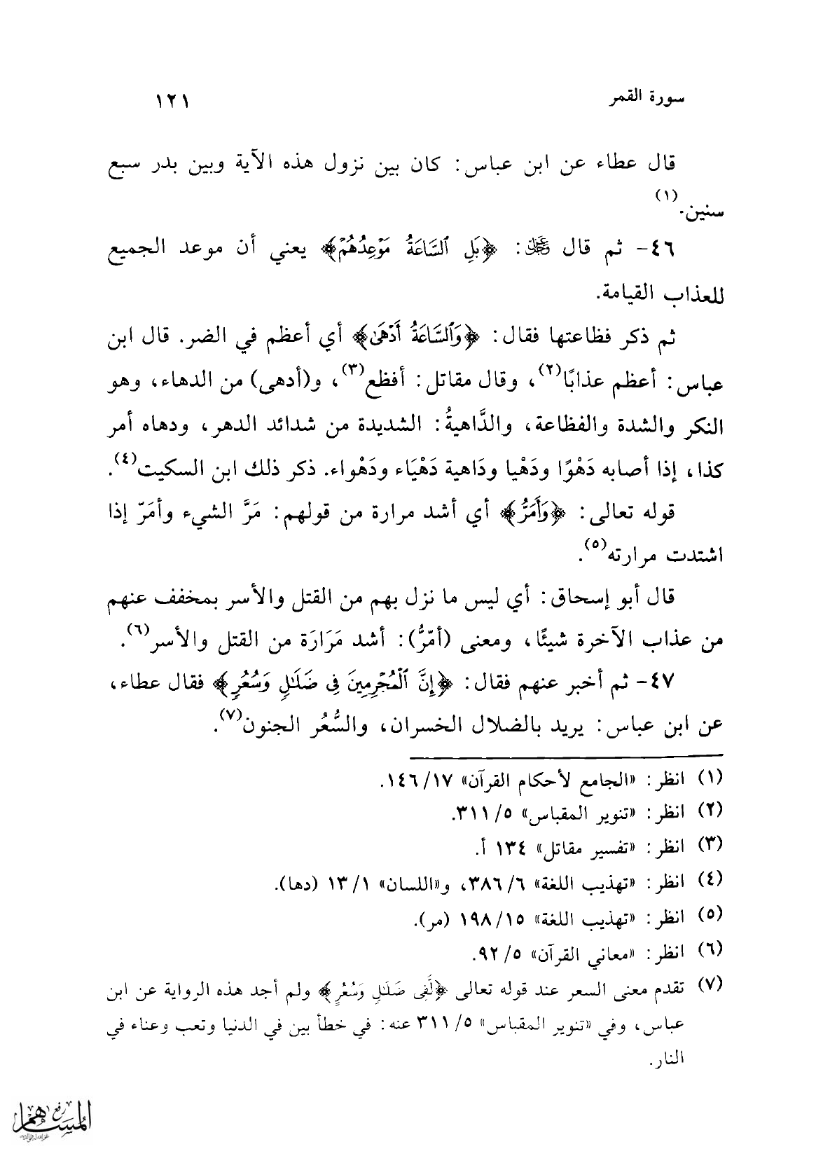 47 - ثم أخبر عنهم فقال: {إِنَّ الْمُجْرِمِينَ فِي ضَلَالٍ وَسُعُرٍ} فقال عطاء، عن ابن عباس: يريد بالضلال الخسران، والسُّعُر الجنون (¬7).