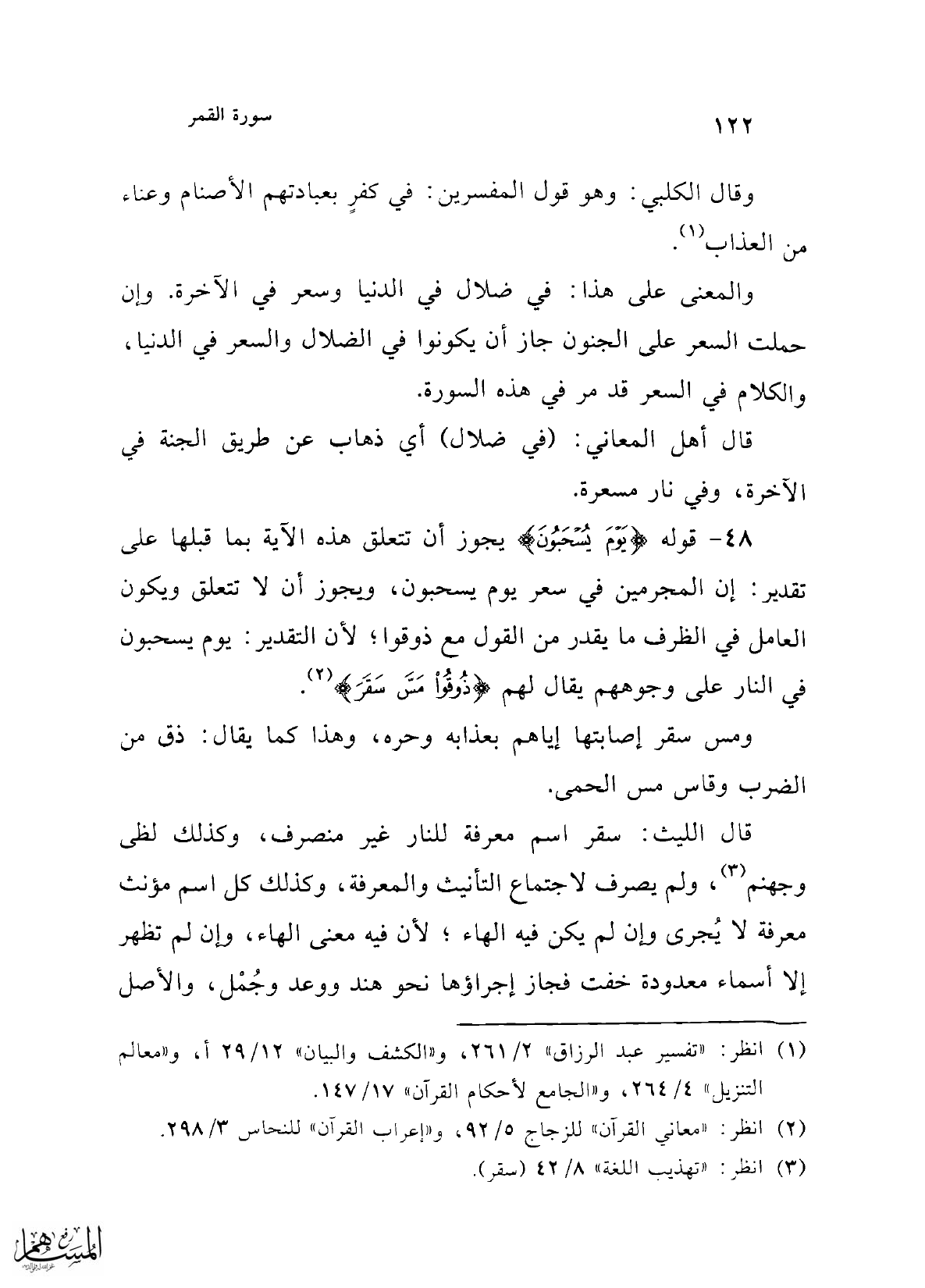 48 - قوله {يَوْمَ يُسْحَبُونَ} يجوز أن تتعلق هذه الآية بما قبلها على تقدير: إن المجرمين في سعر يوم يسحبون، ويجوز أن لا تتعلق ويكون العامل في الظرف ما يقدر من القول مع ذوقوا؛ لأن التقدير: يوم يسحبون في النار على وجوههم يقال لهم {ذُوقُوا مَسَّ سَقَرَ} (¬2).