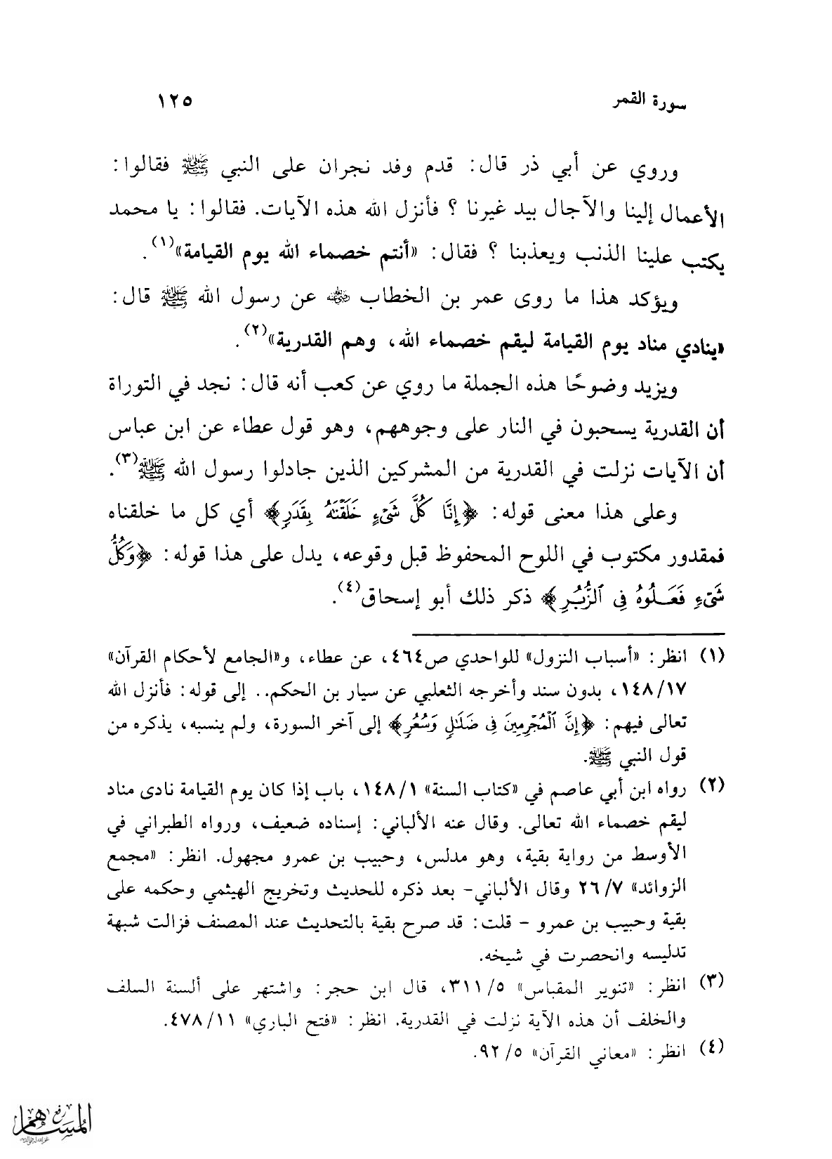 (¬3) انظر: "تنوير المقباس" 5/ 311، قال ابن حجر: وأشتهر على ألسنة السلف والخلف أن هذه الآية نزلت في القدرية. انظر: "فتح الباري" 11/ 478.